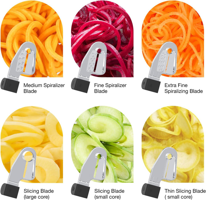 - 6 Schnellwechselklingen und eine Ersatzschälklinge sind im Lieferumfang enthalten: 3 Spiralklingen (mittel, fein und extra fein), 3 Schneideklingen (grosser Kernschneider, kleiner Kern und dünnes Schneiden), 1 Schälklinge.