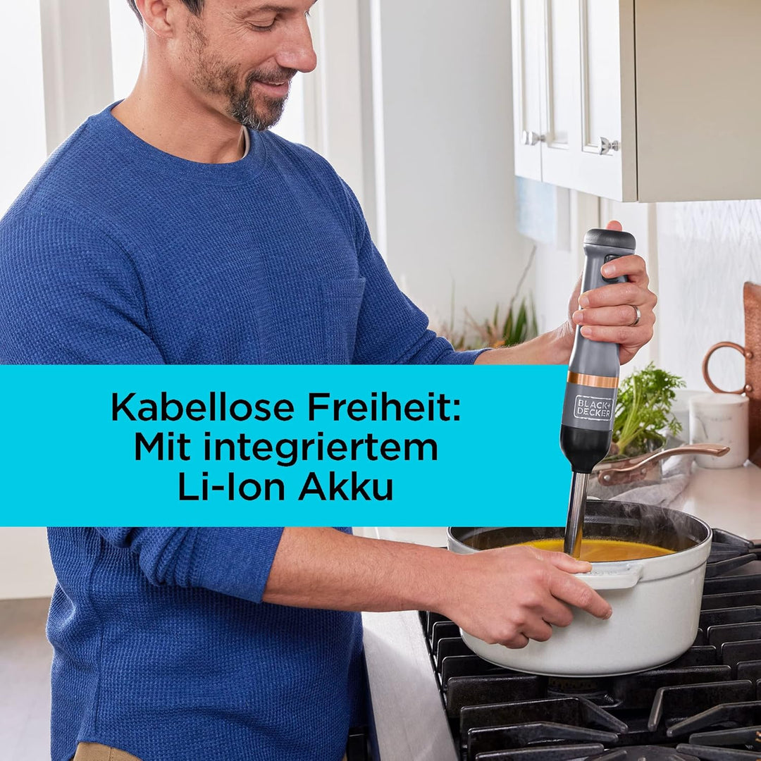 - Kabellose Freiheit: Der BLACK+DECKER Stabmixer bietet kabellose Freiheit durch den integrierten Lithium-Ionen-Akku, der eine anhaltende Leistung von bis zu 24 Minuten ermöglicht