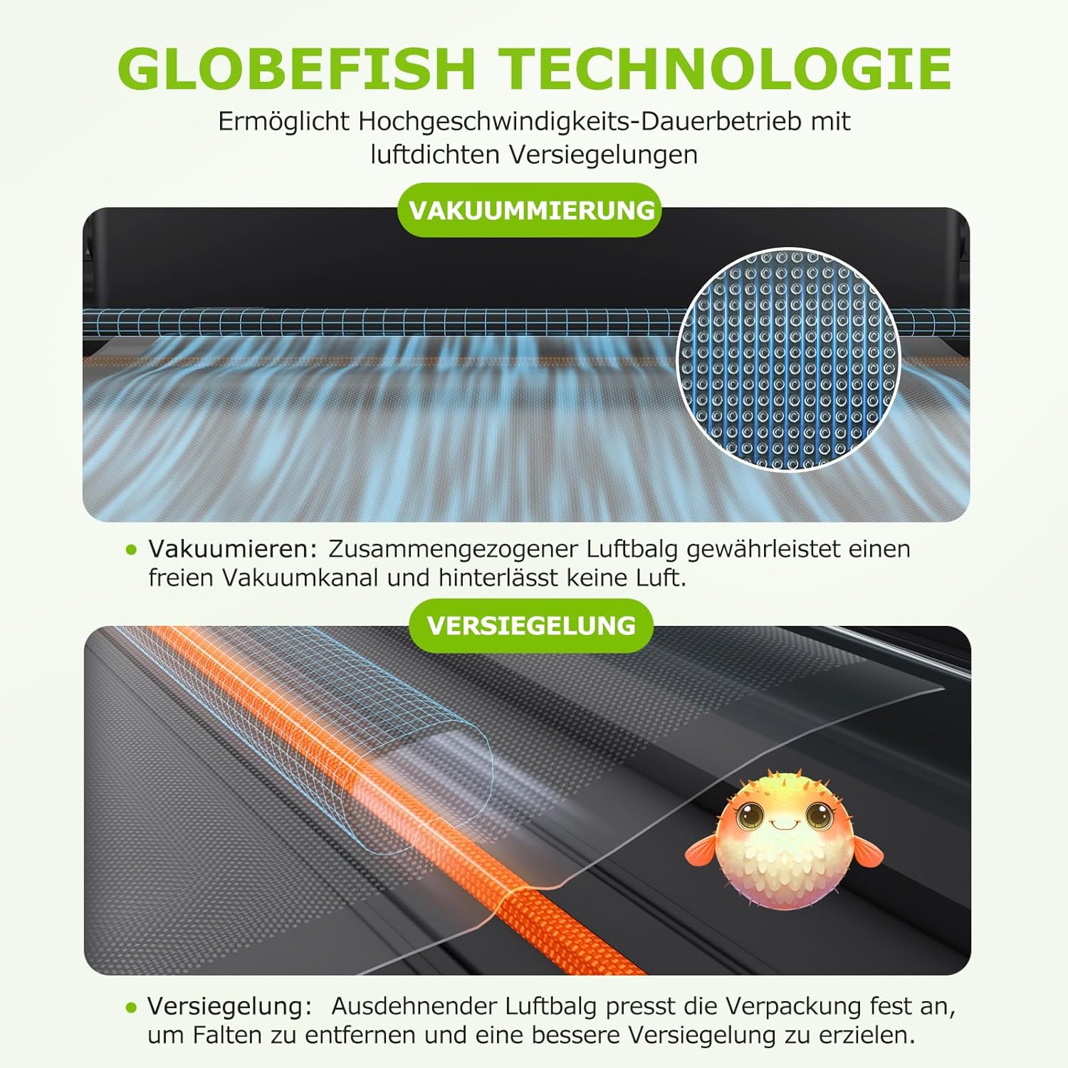 - Starke Saugkraft: Die verbesserte 130-W-Hochleistungsvakuumpumpe bietet eine starke und stabile Saugkraft und die Hochgeschwindigkeits-Dauerbetriebstechnologie von Globefish ermöglicht der Maschine ein schnelleres und festeres Versiegeln, wodurch die