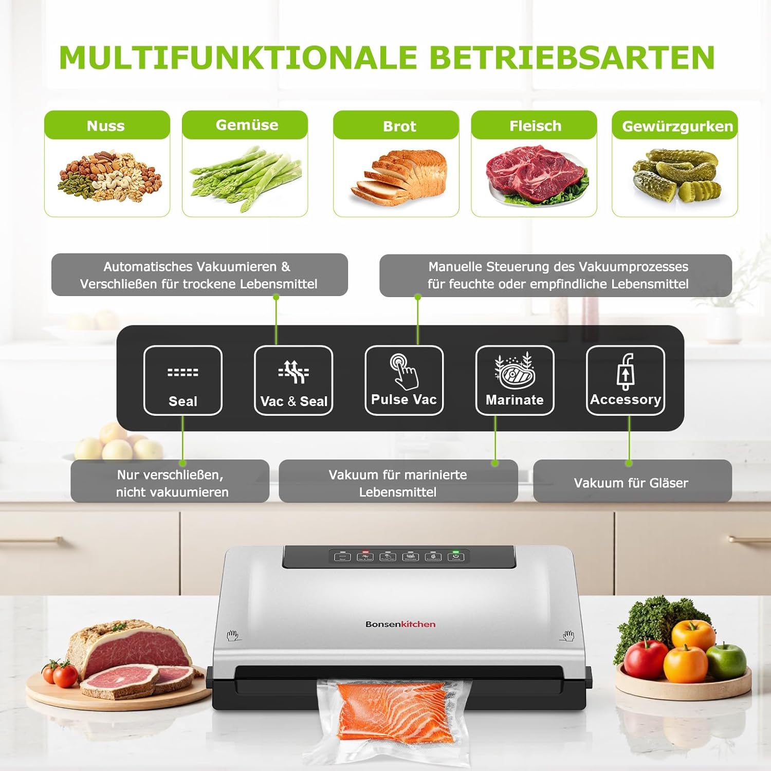 - 5 Multifunktionale Modi: Vac & Seal - kann automatisch vakuumieren und versiegeln; Pluse Vac - kann den Vakuumiervorgang manuell selbst steuern, und dann wird die Maschine automatisch versiegeln; Seal - zum schnellen Versiegeln von Beuteln ohne