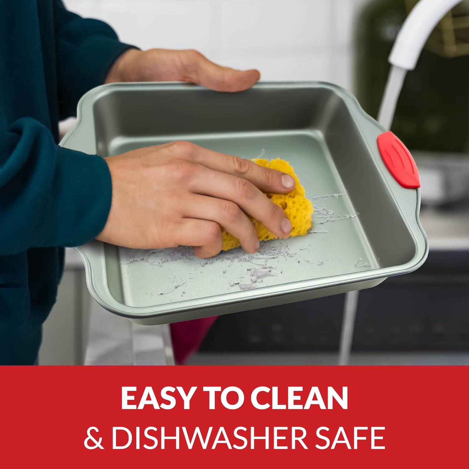 - Ergonomisches Design: Quadratische Kuchenform aus Stahl mit Antihaftbeschichtung, 20,3 cm lang x 20,3 cm breit x 5,1 cm tief, strukturierte, rote Silikon-Griffe