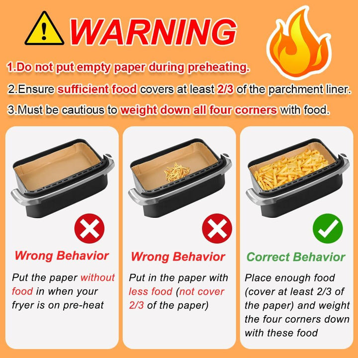 - WARNUNG: 1. Legen Sie während des Vorheizens keine leeren Papiere ein. 2. Stellen Sie sicher, dass ausreichend Essen mindestens 2/3 des Pergamentliners bedeckt. 3. Achten Sie darauf, alle vier Ecken mit Essen zu beschweren. 4. Die maximale Heizzeit