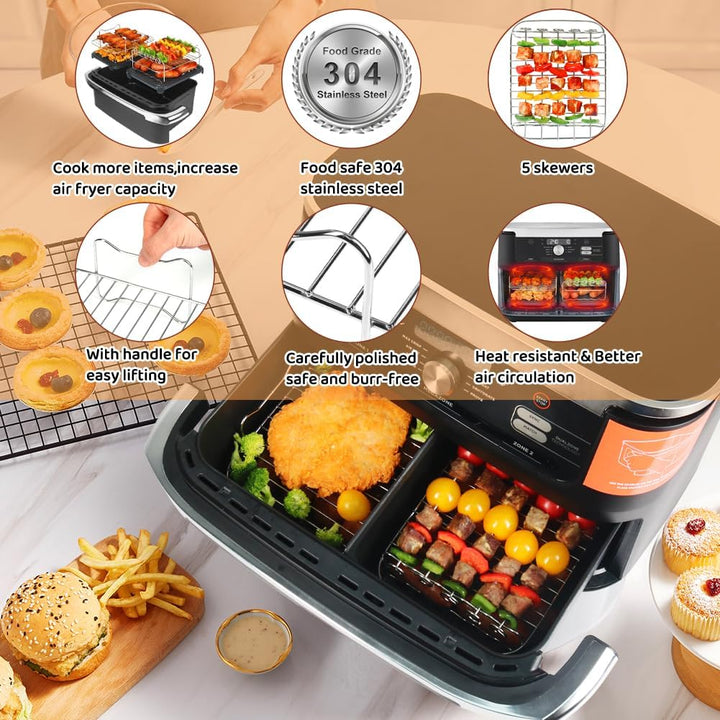 - 【7-teiliges Luftfritteusen-Zubehör】: Enthält 2 Stück Luftfritteusen-Silikoneinlagen, 2 Stück Edelstahl-Racks und 5 Spiesse sowie 1 Stück Silikonzange, 1 Stück Silikonspatel und 1 Stück Backpinsel