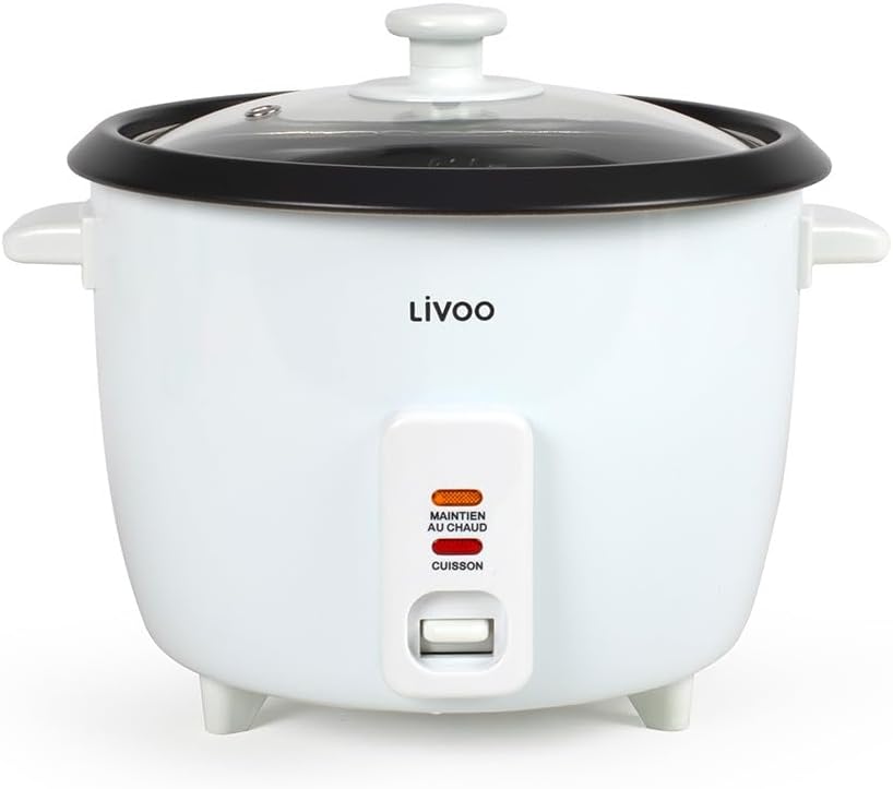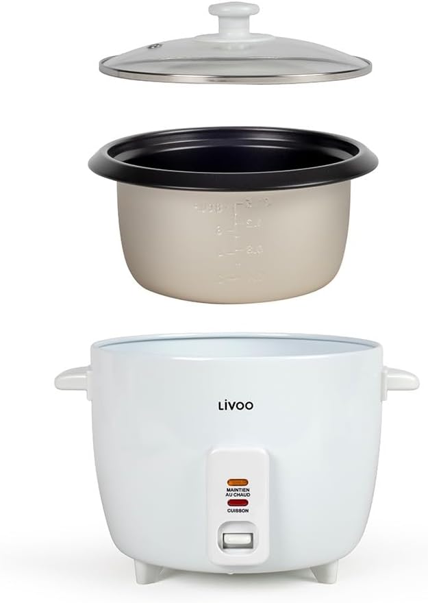 - Reiskocher - Farbe: Weiss - inkl. Alu-Dämpfeinsatz - inkl. herausnehmbarer antihaftbeschichteter Topf - Sicherheitsglasdeckel mit Dampfauslassöffnung - automatischer Warmhaltemodus - 2 Kontrollleuchten für Kochen und Warmhalten - inkl. Messbecher -