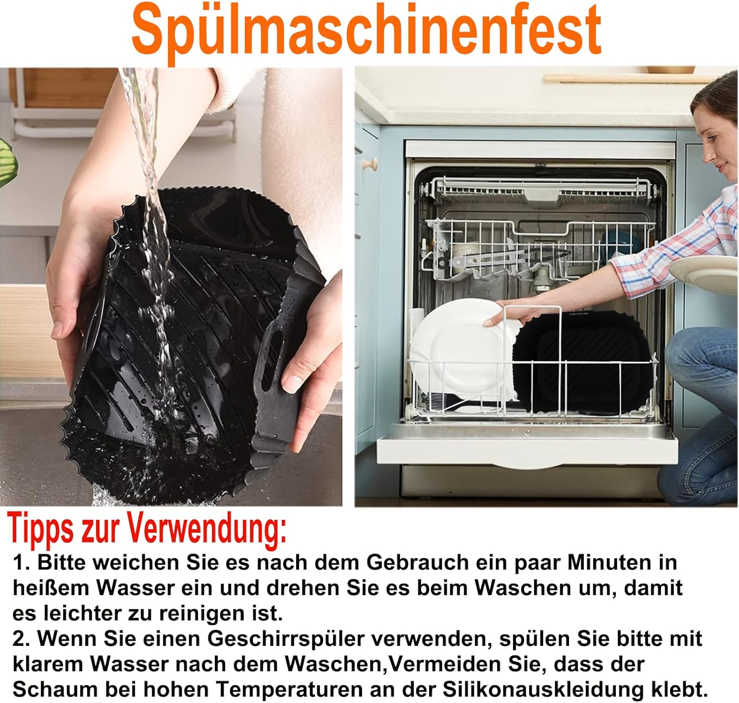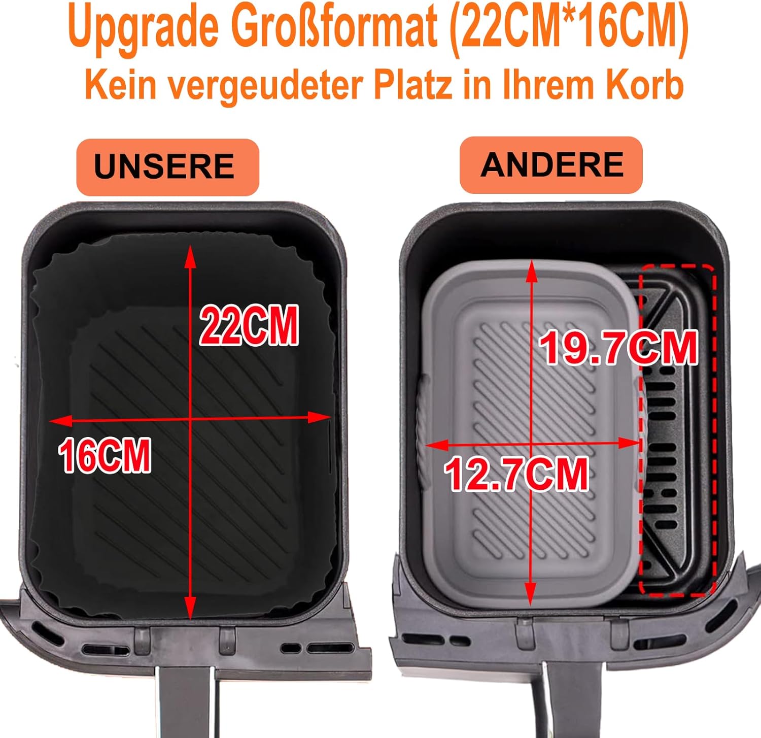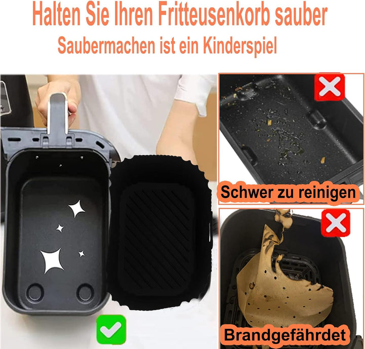- [Wiederverwendbare Airfryer Silikonform]: Hergestellt aus 100% lebensmittelechtem Silikon, nicht klebend, ungiftig, BPA-frei, geruchsneutral, hitzebeständig bis 230℃, brennt nicht an, sicherer und umweltfreundlicher als Luftfritteusen-Papiereinlagen.