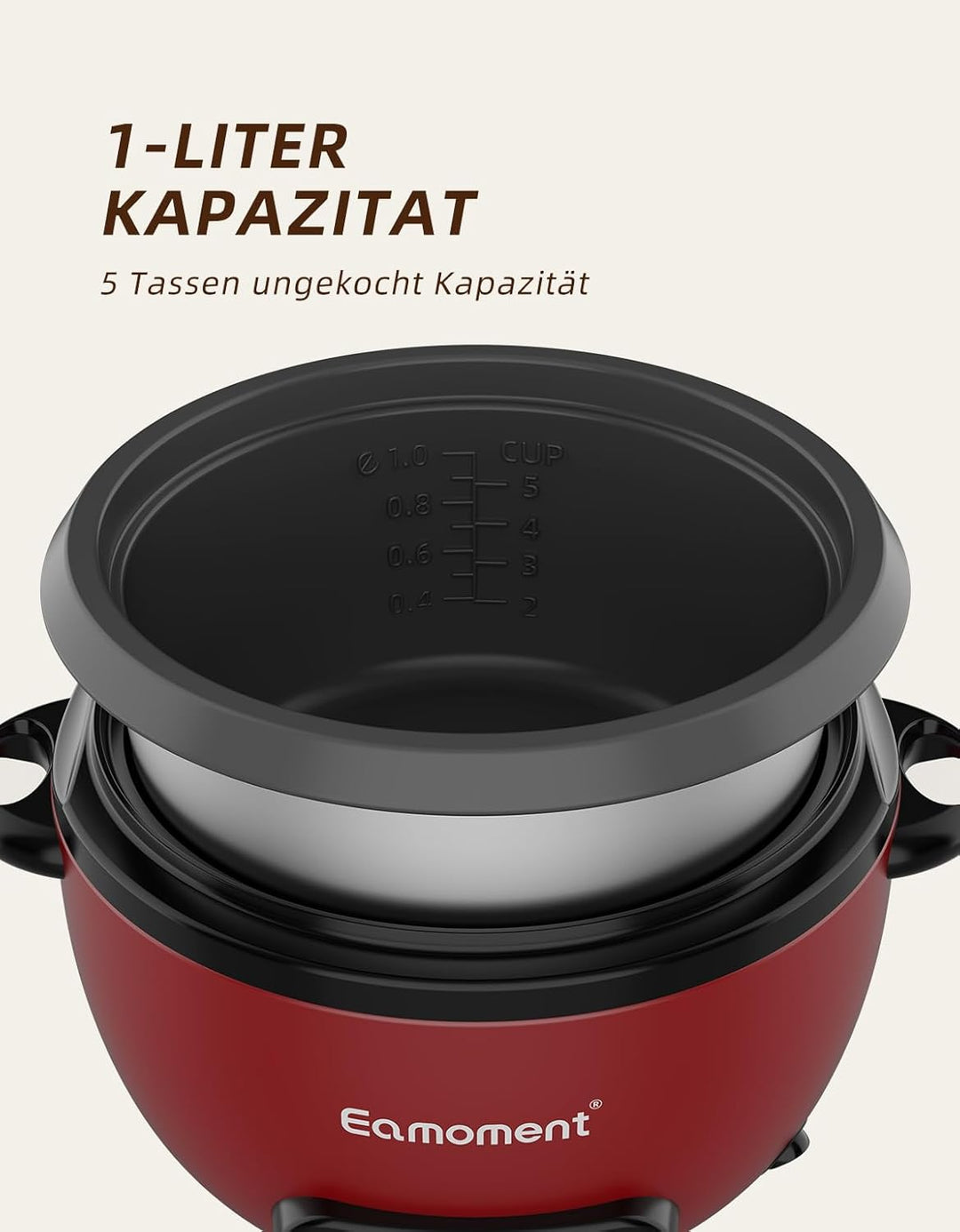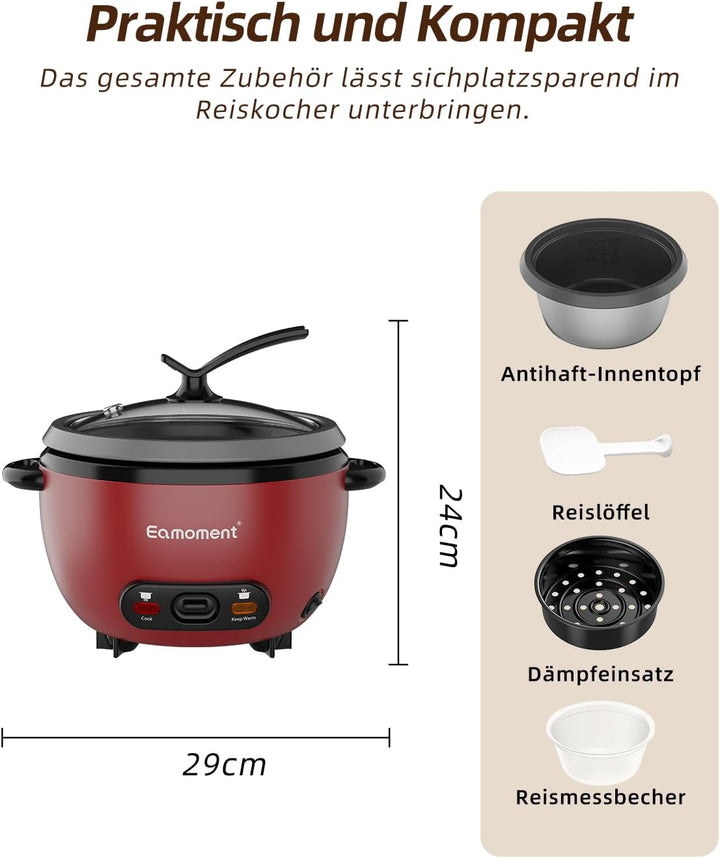 Eamoment ERC-5P07RD 1L | 400W Reiskocher & Schwarzer Dämpfeinsatz Warm & Kochen 1-5 Personen Antihaf