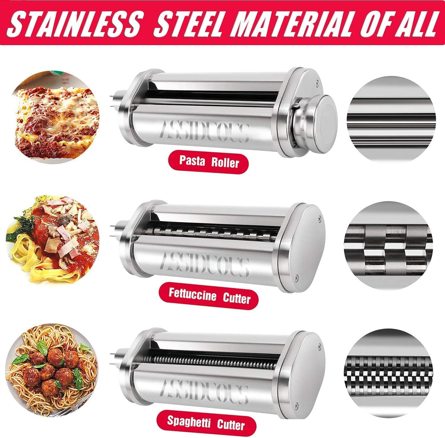 - 【Edelstahlmaterial】 Mixerzubehör für KitchenAid besteht aus Edelstahl 304, einschliesslich Nudelroller, Spaghettischneider und Fettuccineschneider. Edelstahl hat eine hohe Stabilität und Fähigkeit, Nudeln zu schneiden, bietet eine gleichmässige Leistung für die Herstellung von Nudeln und verbessert den Geschmack von Nudeln.