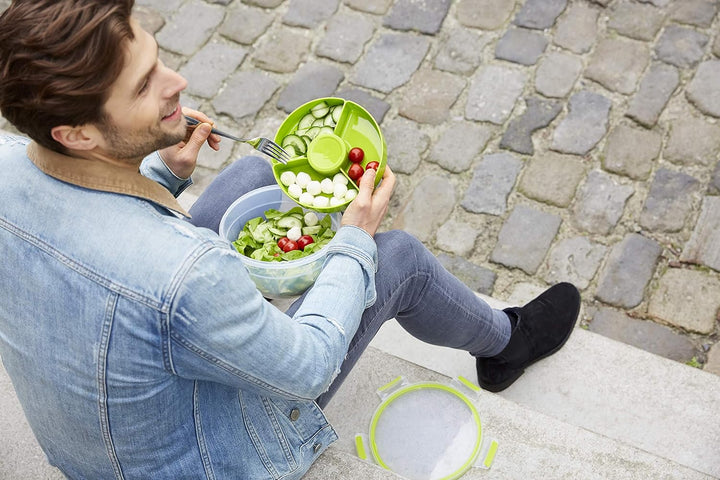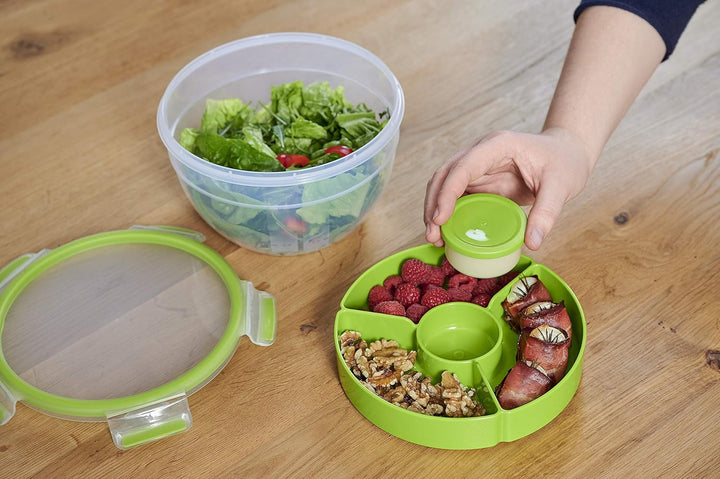 - Salatbox mit zwei Fächern, eines davon mit Deckel, zum Isolieren der Sauce und der Beilagen (Cherry-Tomaten, Mozzarella-Kugeln).