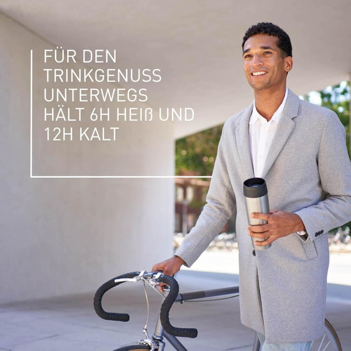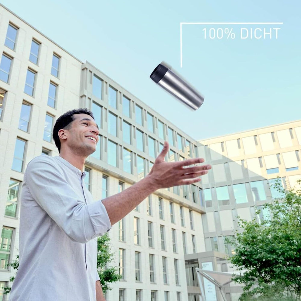 - Sichere Nutzung unterwegs: Der Isolierbecher ist im geschlossenen Zustand 100% dicht, mit angenehmer Oberfläche für sicheren Halt; passt in alle gängigen Auto-Getränkehalter