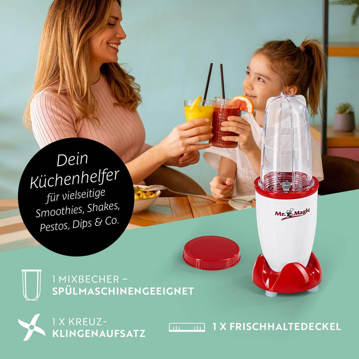 - LIEFERUMFANG - 1 x Mr.Magic Motoreinheit 250 Watt, 1 x Kreuzklingenaufsatz, 1 x Mixbecher 500ml, 1 x Frischhaltedeckel