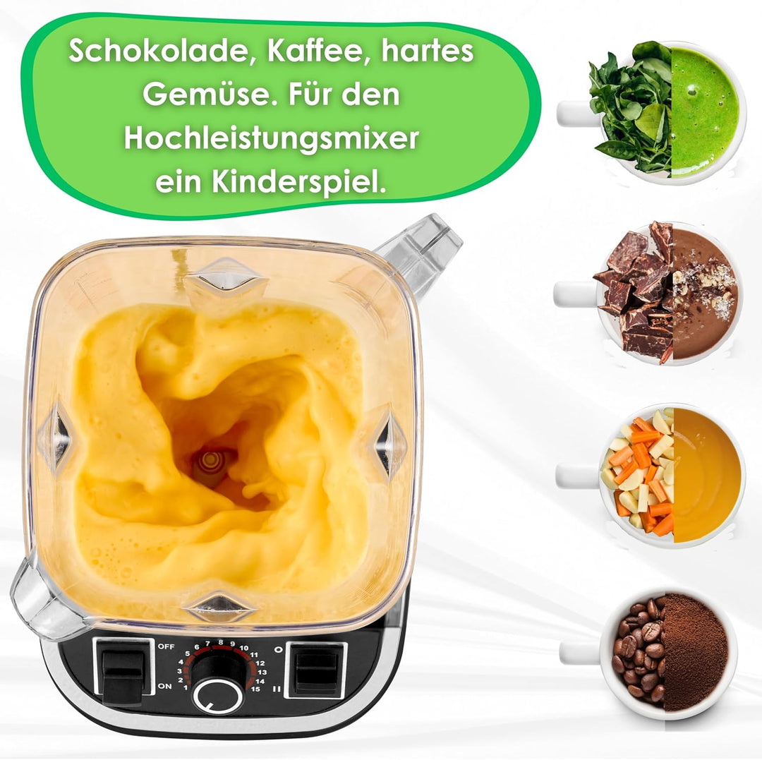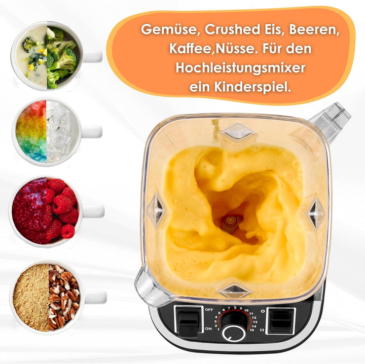 - ✔️ Warum unser Hochleistungsmixer? Dieser Mixer kombiniert höchste Leistung, intuitive Bedienung und langlebige Materialien. Mit seinem modernen Design und durchdachten Funktionen wird er schnell zu Ihrem unverzichtbaren Küchenhelfer, der sowohl