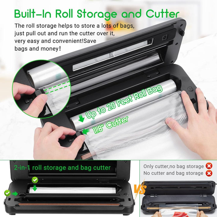 - 【Eingebauter Cutter & Beutelkammer Vakuumierer】 Er ist mit einem integrierten 11.8/30cm Beutelschneider und einer Beutelkammer zur Aufbewahrung von Vakuumbeuteln ausgestattet, sodass wir mühelos Lebensmittelbeutel in unserer gewünschten Grösse