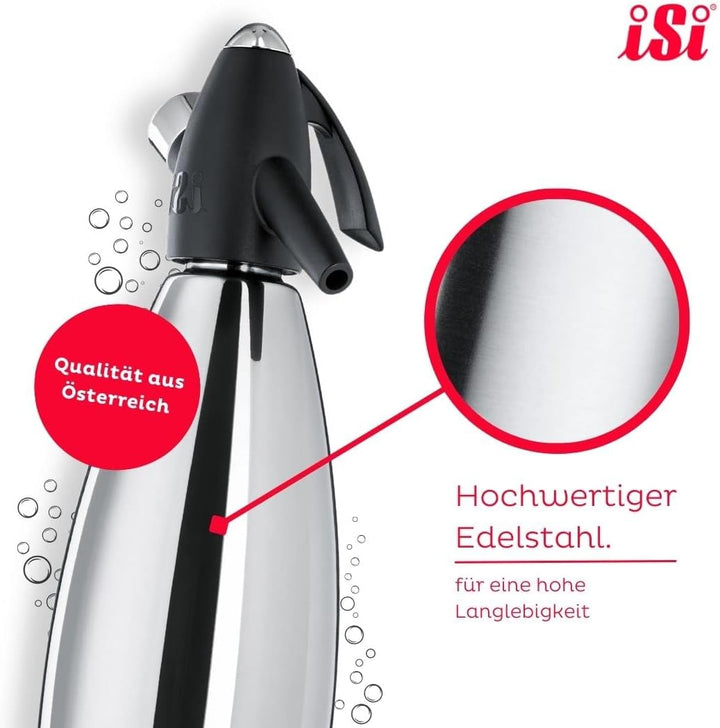 - STILVOLLER GENUSS: Mit dem iSi Soda-Siphon geniessen Sie jederzeit erfrischendes, prickelndes Sodawasser mit dem extra Fizz. Für den puren Genuss oder zum Aufspritzen von Longdrinks und Cocktails.