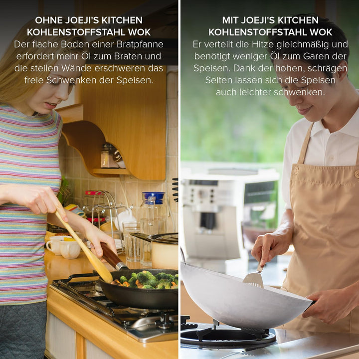 - Langlebig & Antihaft - Für Langlebigkeit konzipiert, entwickelt unser Kohlenstoffstahl-Wok mit der richtigen Würzung im Laufe der Zeit eine natürliche Antihaft-Oberfläche, was ihn ideal für das Kochen mit wenig Öl macht.