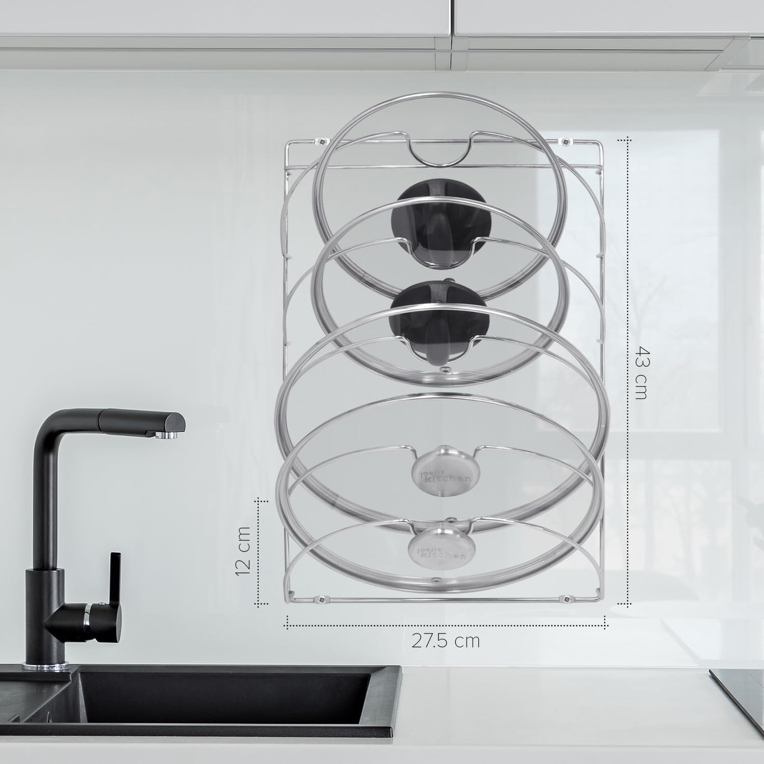 - Multifunktional: Dieser Topfdeckelhalter hat 5 Schlitze, die breit genug sind, um die meisten Grössen von Deckeln, Tabletts, Brettern und anderen Küchenutensilien aufzunehmen. Dieser Topfdeckelhalter ermöglicht auch ein einfaches Ablassen von Wasser