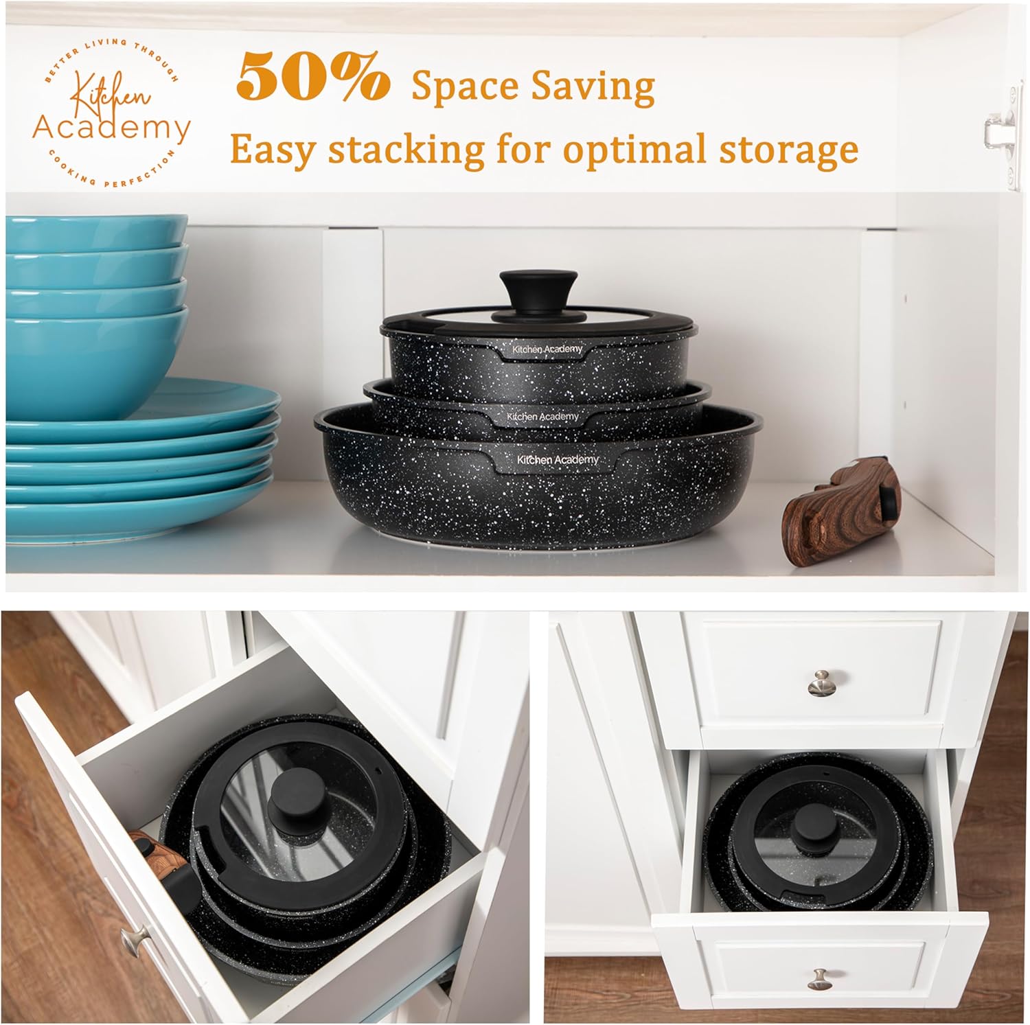 - Induktionskompatibel – Wenn es um den Innenraum geht, verwendet dieses Kochgeschirr einen Aluminiumkern. Das Ergebnis ist, dass unser Topf- und Pfannenset schnell und gleichmässig Wärme verteilen kann. Geeignet für Induktionsherde, Gasherde,