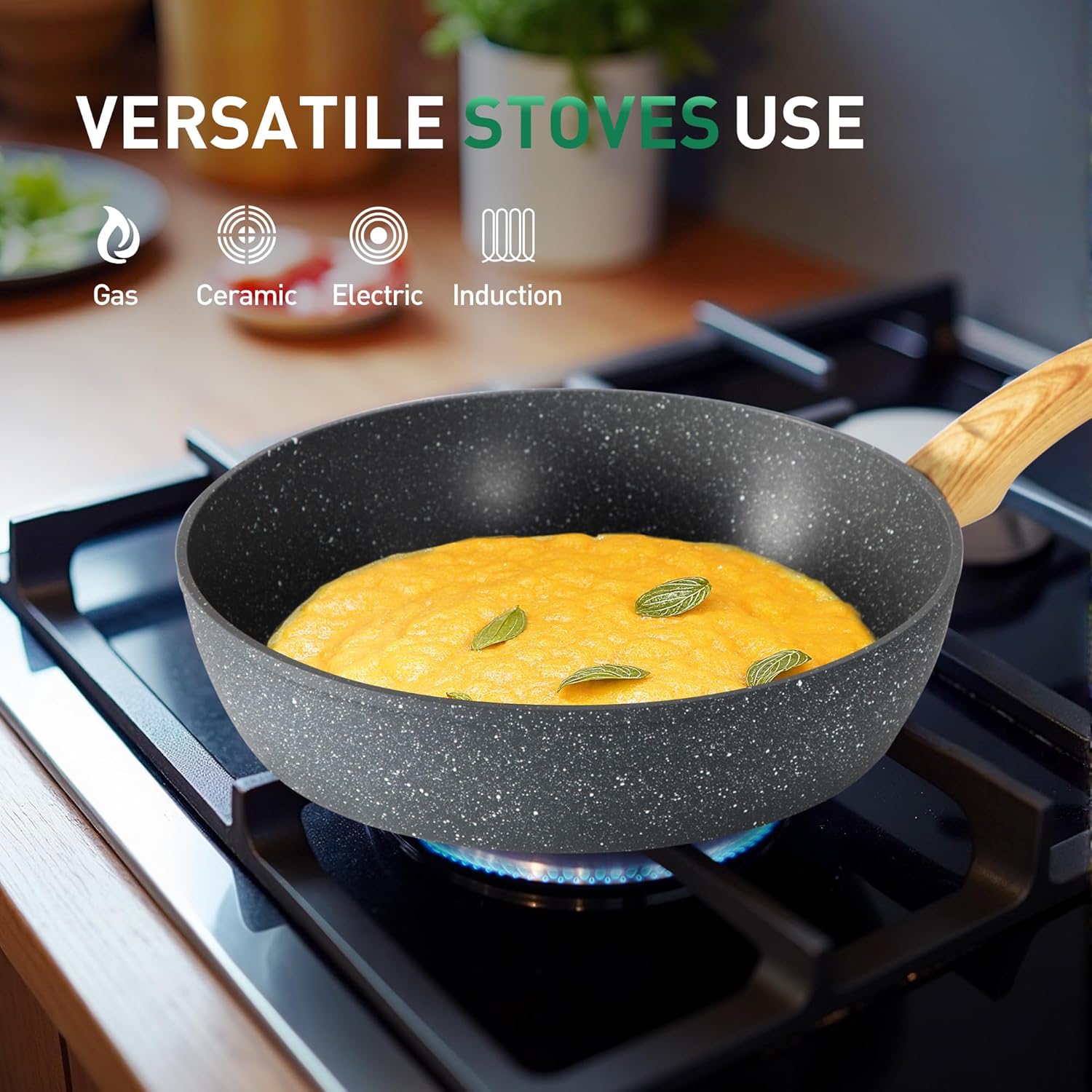- Doppelboden Aluminium Cookware: Diese Pfannensets Antihaft-Kochgeschirr bestehen aus gepresstem Aluminium für eine effiziente Erwärmung. Die hochwarmfeste Edelstahlbasis und die Aluminiumkonstruktion sorgen für eine gleichmässige und schnelle