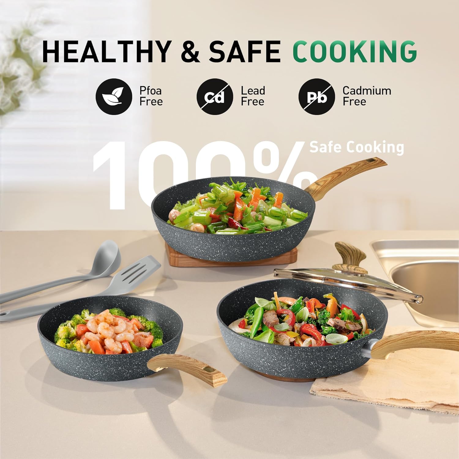 - Zuverlässige und Langlebige Nicht-Stick-Pan-Sets: Die drei Aussenschichten aus Granit in Lebensmittelqualität sorgen für maximale Haltbarkeit der Töpfe und Pfannen und verhindern Alterung oder Verformung durch Hitze. Dank die drei Aussenschichten