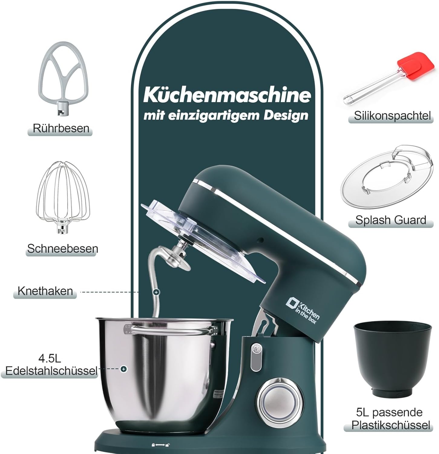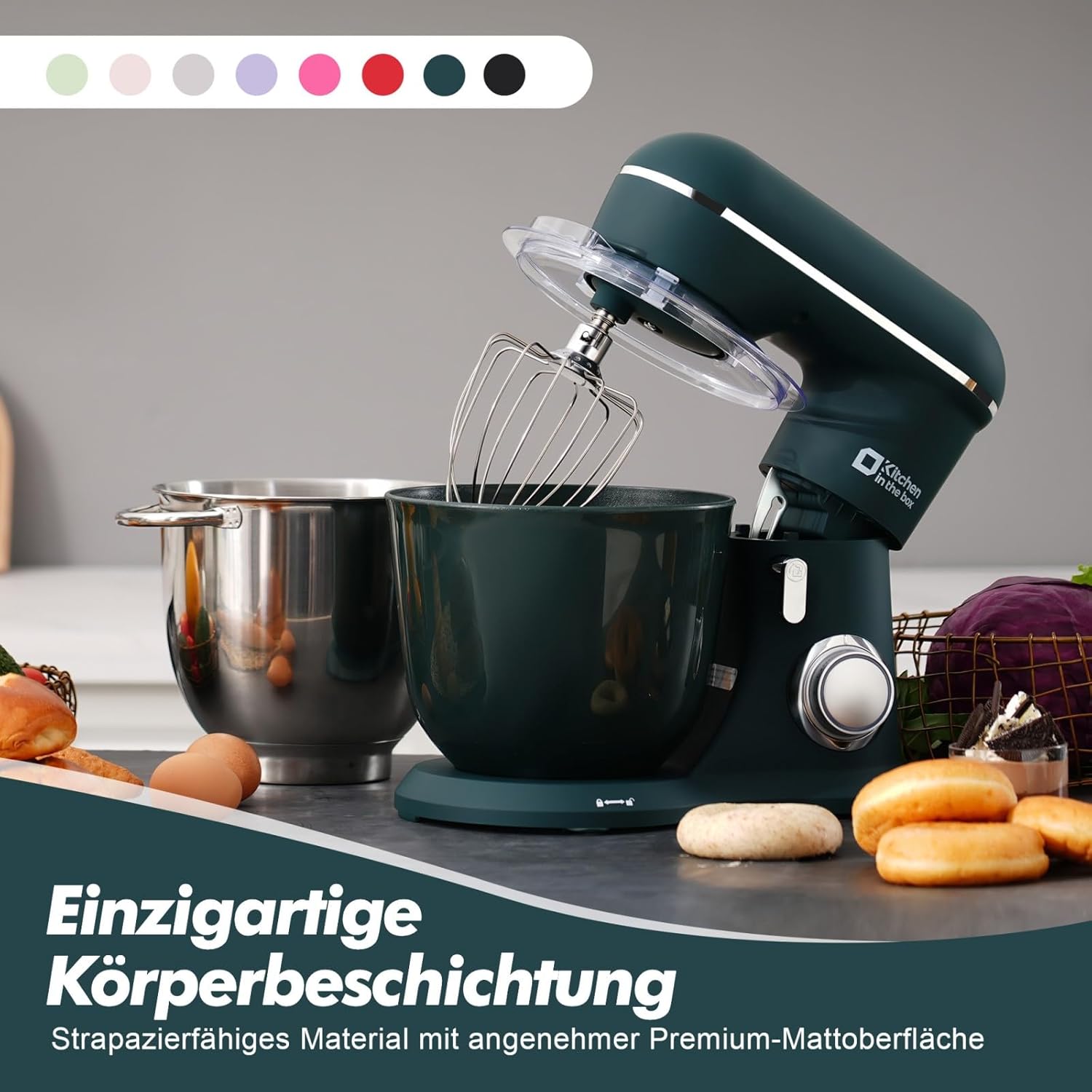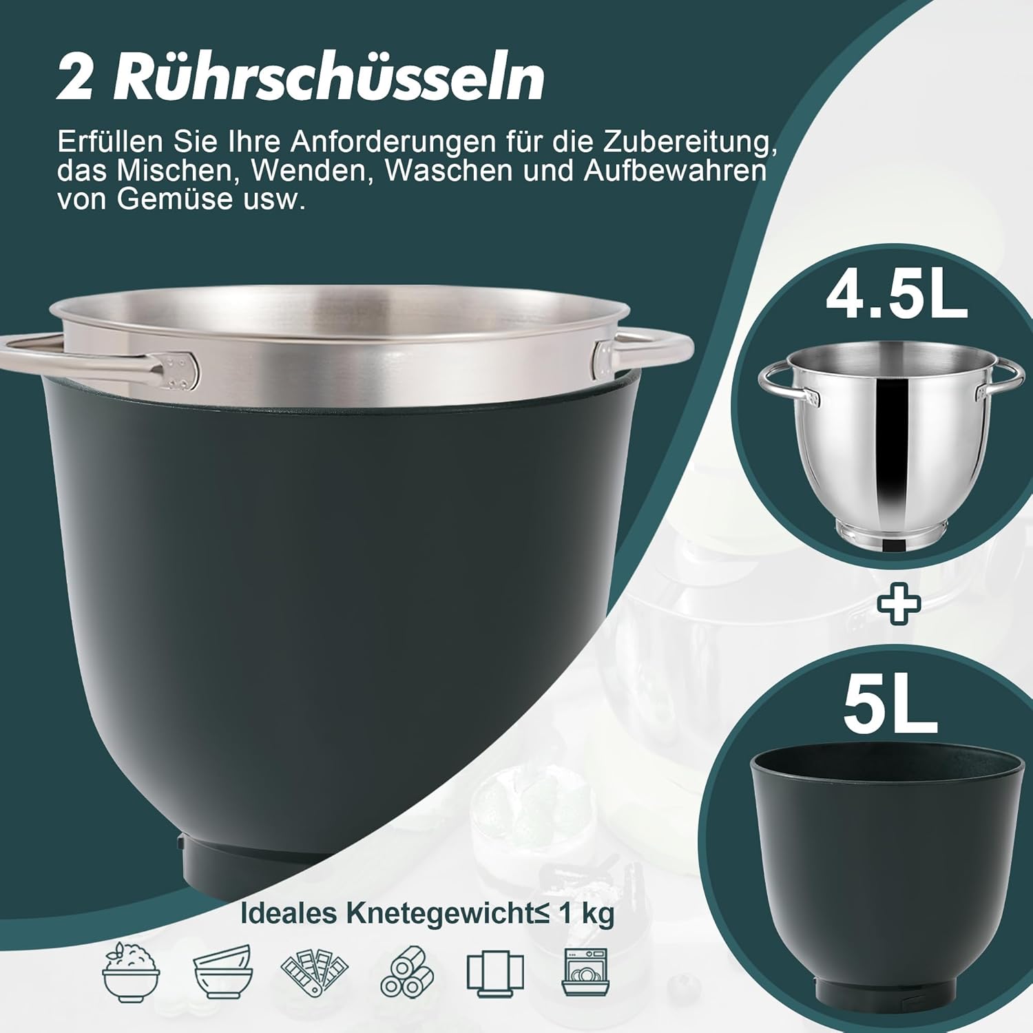 - 4,5 L & 5 L Doppelschüssel: Die Küchenmaschine ist mit einer 5 L Schüssel aus lebensmittelechtem Kunststoff und einer 4,5 L Schüssel aus Edelstahl mit Doppelgriffen ausgestattet, um Ihren unterschiedlichen Backanforderungen gerecht zu werden. Die