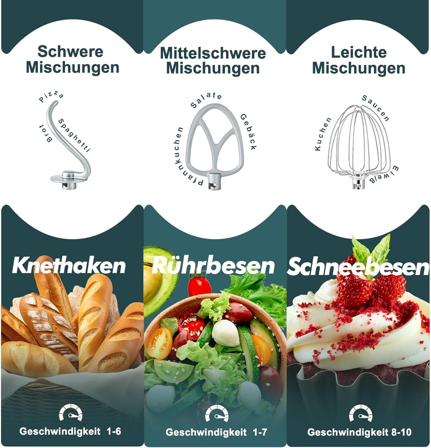 - 10+P Geschwindigkeit: Die Teigmaschine verfügt über eine 10+P Geschwindigkeitseinstellung, die für fast alle Rezepte geeignet ist, egal ob schnelles oder feines Mischen, um Ihren unterschiedlichen Bedürfnissen gerecht zu werden. Die Pulse-Funktion