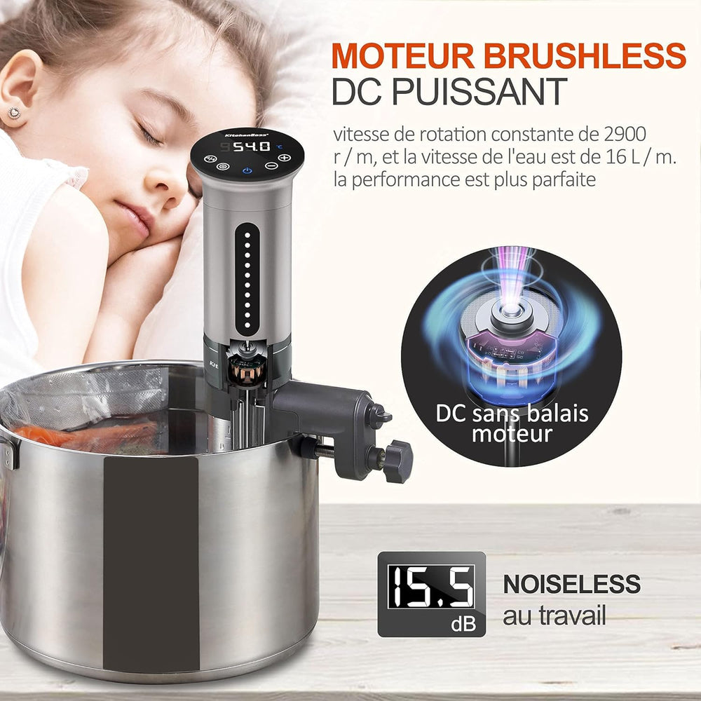 - Bürstenloser Gleichstrommotor: KitchenBoss G300 / G310 Tauchsieder verwendet den gleichen hochwertigen bürstenlosen Gleichstrommotor wie die hochwertigen Drohnen, gleichmässige Drehung von 2900 U/m, super Leistung, mehr langlebig (KitchenBoss Vakuumgarer kann kontinuierlich bis zu 99 Stunden und 59 Minuten verwendet werden)