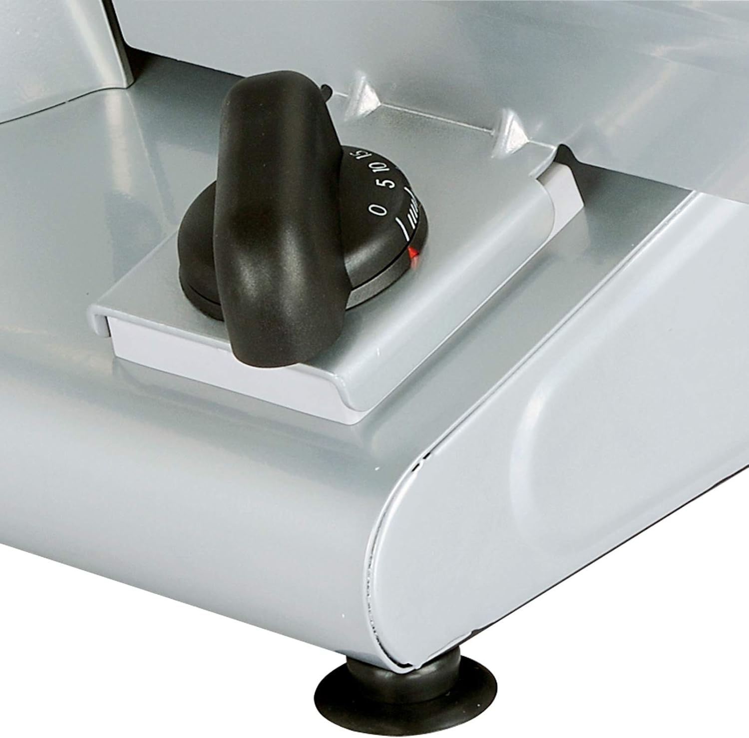 - SPEZIFIKATIONEN - Unsere Kitchener Pro Aufschnittmaschine für Fleisch, Käse und Brot ist aus hochwertigem beschichtetem Stahl und Aluminiumdruckguss, lebensmittelechtem Kunststoff und einer Edelstahlfläche gefertigt. Diese Schneidemaschine ist ein riemengetriebener Elektromotor 230V 150Watt 50Hz, einschliesslich einer 7,5" (190mm) Klinge, einstellbarer Dickenregler, der in der Lage ist, Lebensmittel von dünnem bis zu 5/8" dickem Fleisch im Stil eines Schneidebretts zu schneiden.