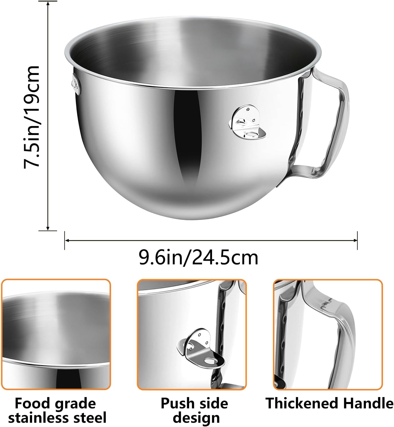 - Das 6 Quart Edelstahl-Mixerschüssel mit Tragegriff ist leicht zu erreichen und das Entleeren des gemischten Teigs ist einfacher.