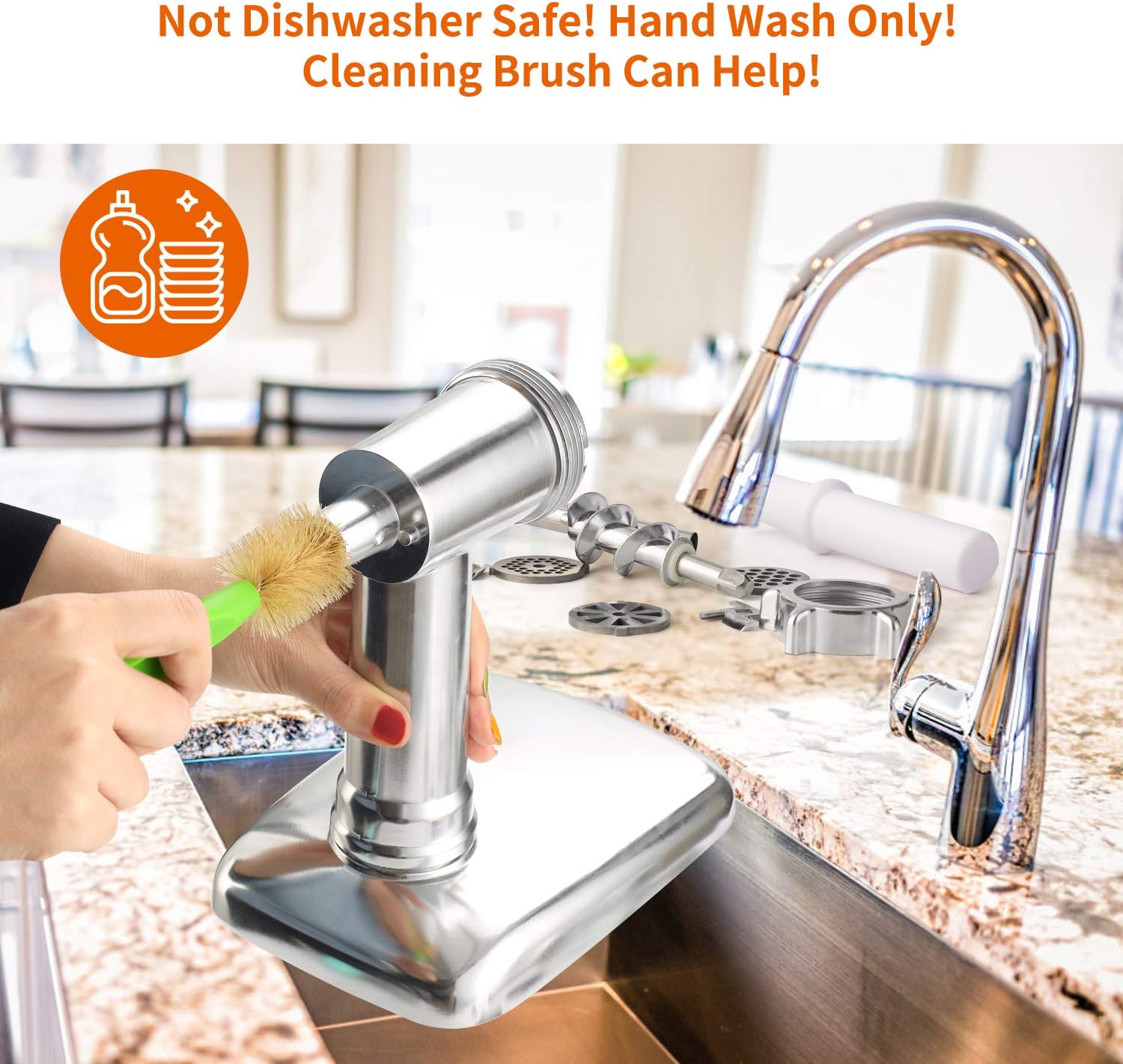 - 🍔 Einfach zu reinigen und zu verwenden: Der Fleischwolfaufsatz ist NICHT spülmaschinenfest, alle Teile sind abnehmbar, Sie können ihn sehr schnell mit Seife, warmem Wasser (unter 122 ° F) und der mitgelieferten Reinigungsbürste reinigen.