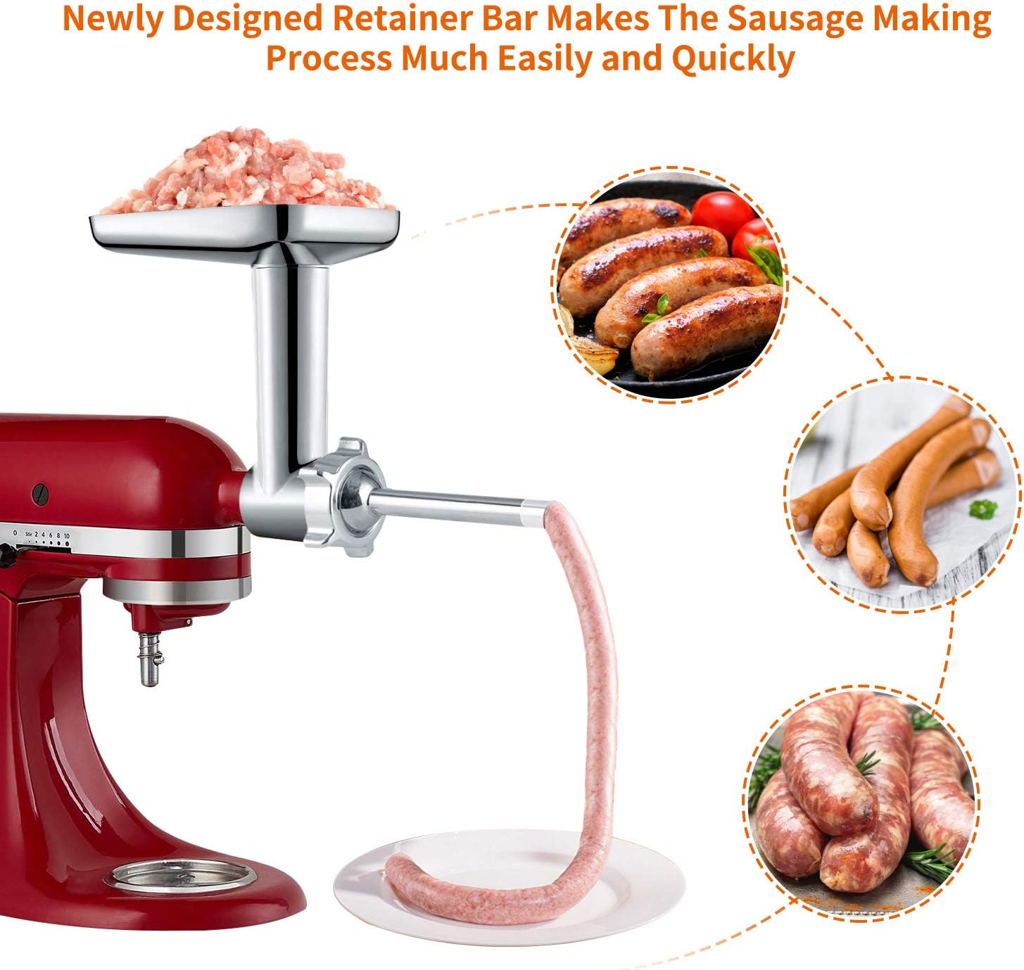- 🌭 Grossartiger Assistent in der Küche: Dieser Lebensmittelwolf-Aufsatz ist einfach anzubringen und zu entfernen. Es enthält: eine Fleischwolfvorrichtung, fünf Grössen von Mahlplatten, zwei Grössen von Mahlmessern, einen Wurstfüllhalter, drei Grössen von Wurstfüllrohren, einen Lebensmittelschieber und eine Reinigungsbürste.