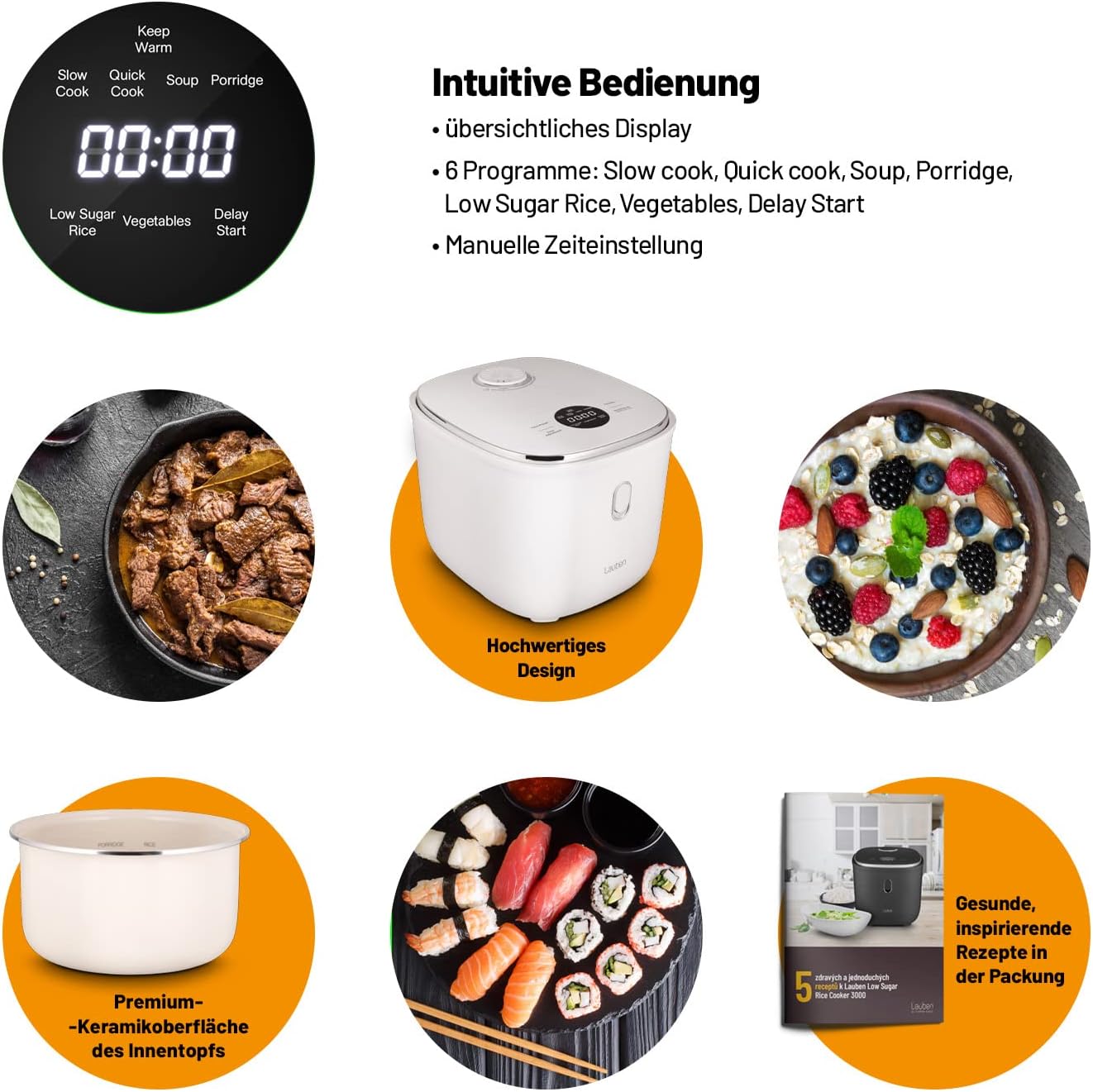 - PREMIUM-MEHRZWECK-REISKOCHER MIT LOW-SUGAR-FUNKTION - bei der die Kohlenhydrate dank der speziellen Kochtechnologie abgetrennt werden. Mit diesem Helfer bringen Sie alle Reissorten zur Vollkommenheit und dank den 6 einstellbaren Modi bereiten Sie schnell