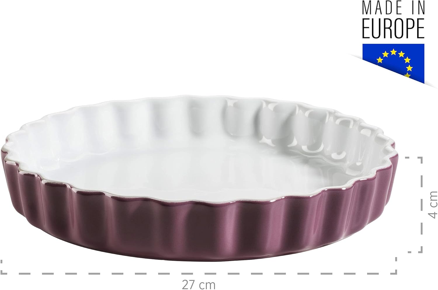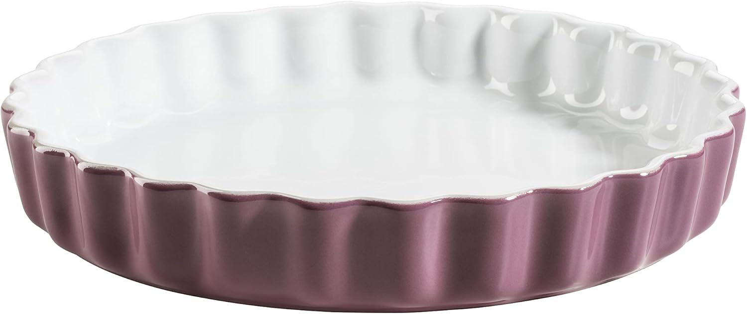 - Schöne Backform mit gewelltem Rand aus dickwandiger Keramik (Steinzeug) für Tarte, Quiche und Obstkuchen. Lasur innen weiss, aussen in pastelligem, dunklem Lila