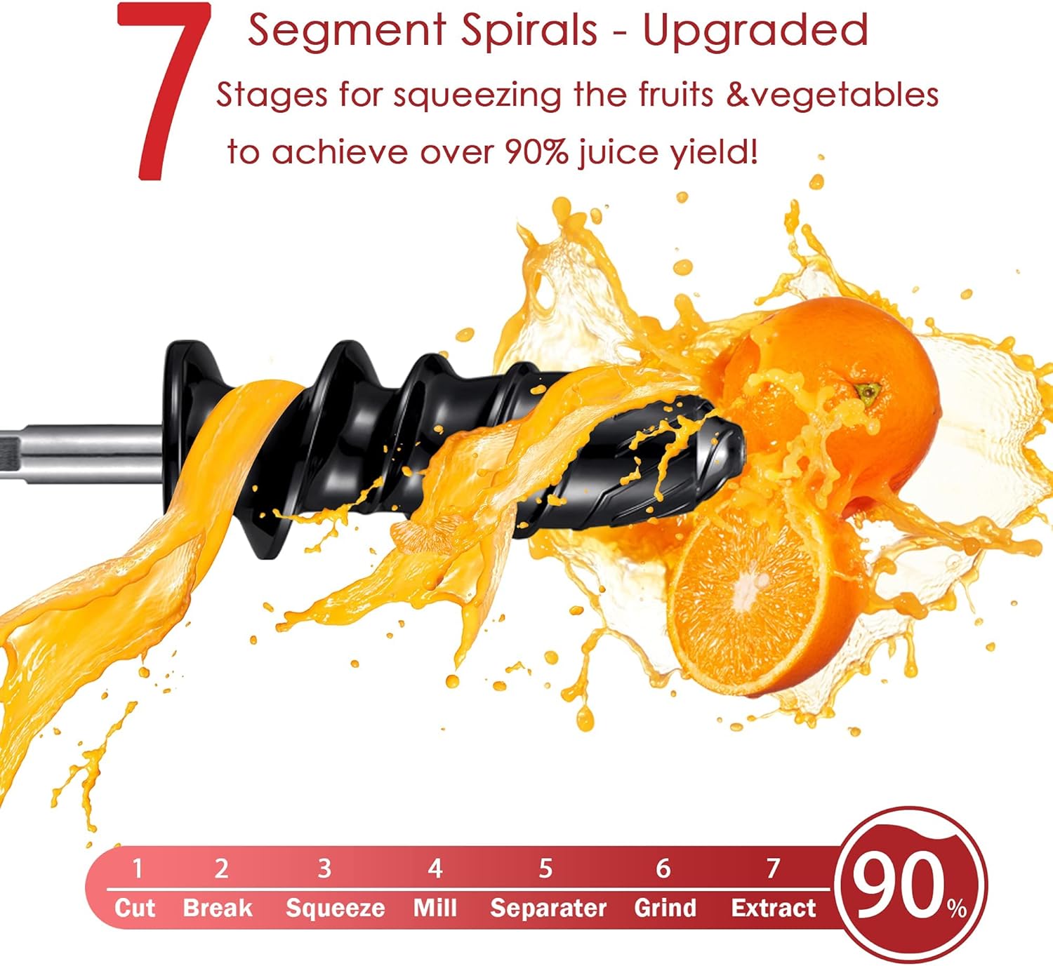 - Weniger Oxidation, mehr Ernährung: Das verbesserte Spiralsystem – 7 Segmentspiralen öffnen jede Zelle für maximale Saftausbeute. Kein Hinzufügen von Wasser wie bei anderen Entsaftern erforderlich. Keine Notwendigkeit, den Trester manuell zu