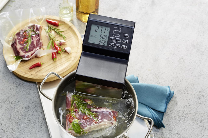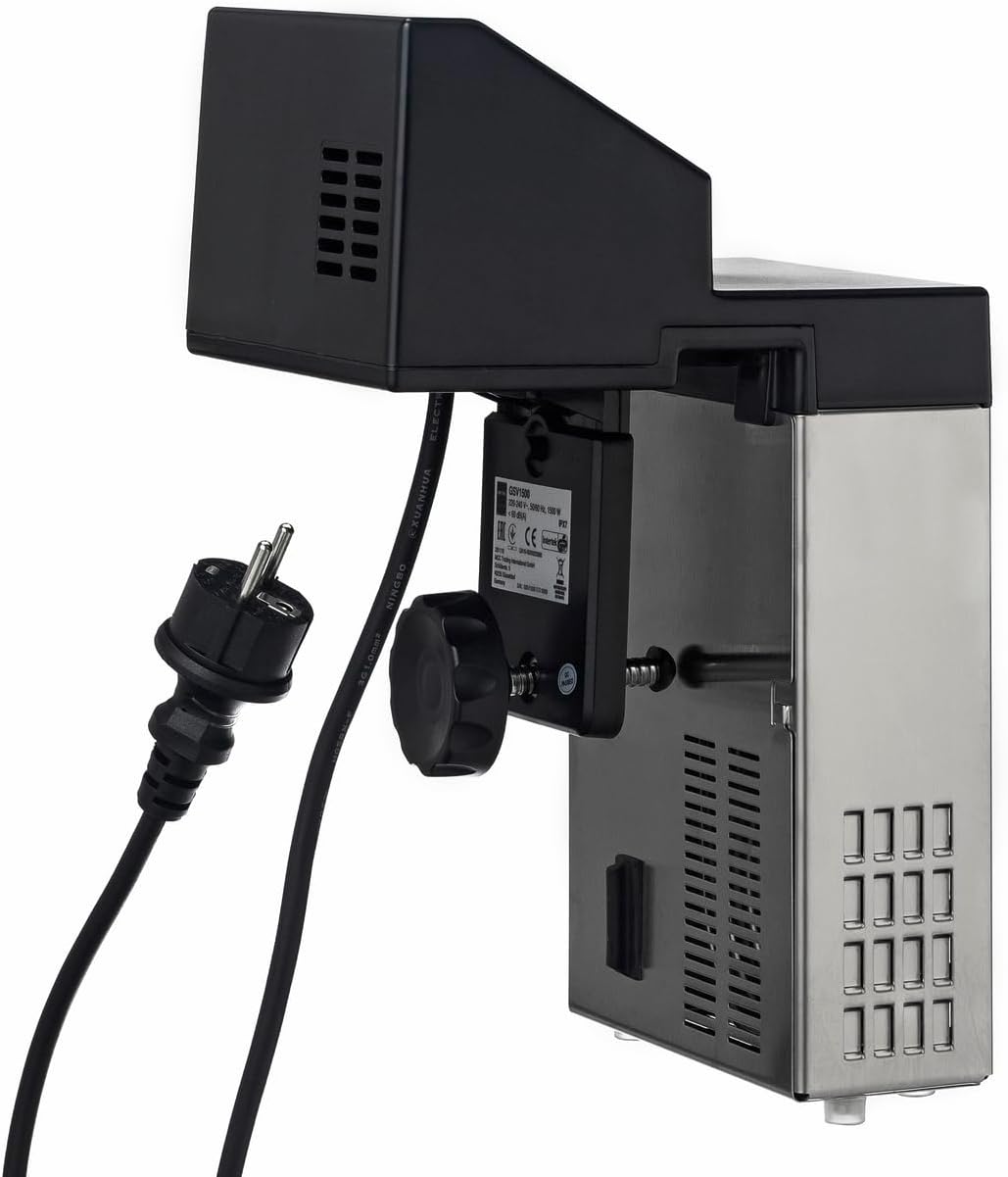 - Der Sous-Vide Schongarer besitzt eine Leistung von 1500W, 230V und arbeitet in einem Temperaturbereich von 5 bis 99°C (0,1°C pro Schritt)