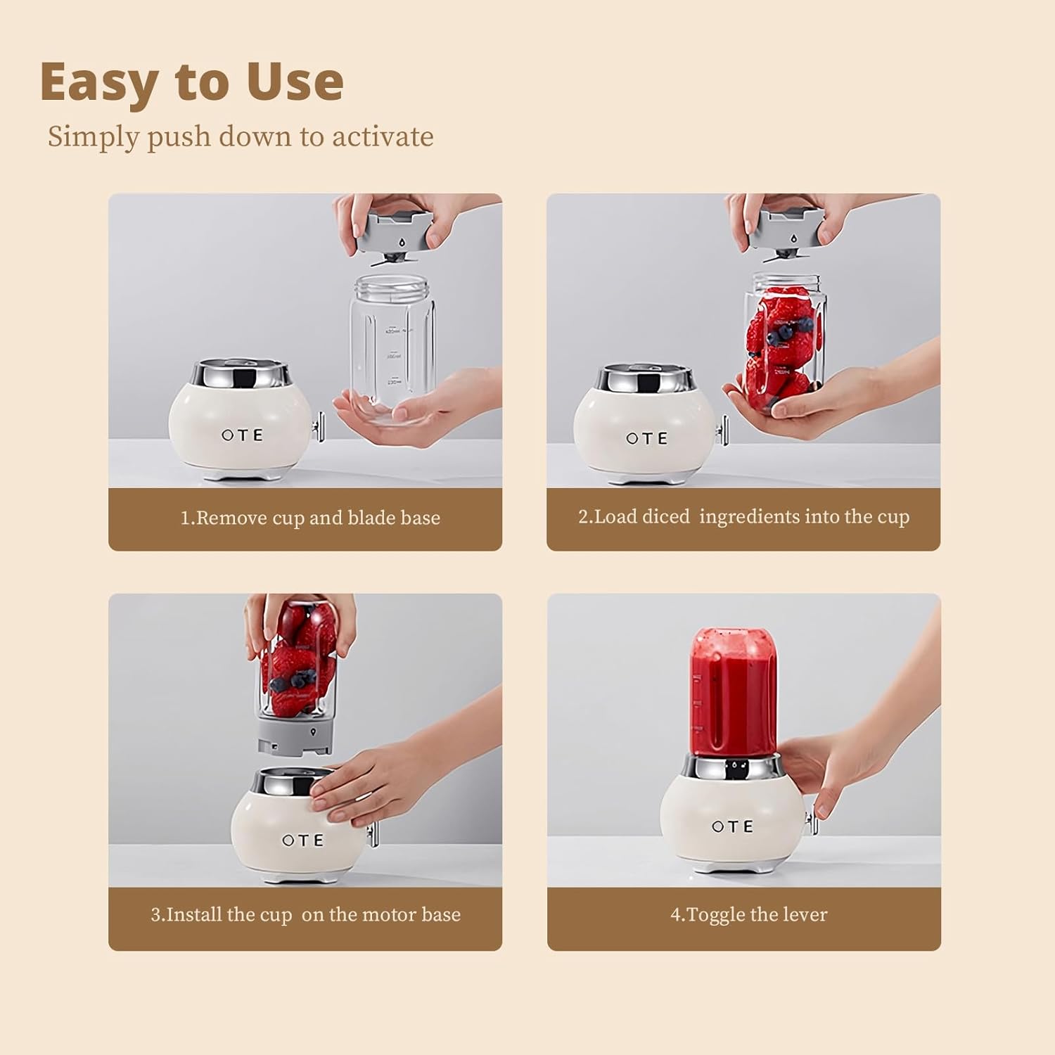 - 🍨🍨Mini Blender Einfach zu Verwenden: 4 Schritte zum Selbermachen. 1. Entfernen Sie den Becher und die Klingenbasis gegen den Uhrzeigersinn. 2. Mit den gehackten Früchten und Eis beladen 3. Den mitgelieferten Becher wieder einsetzen 4. Dann den