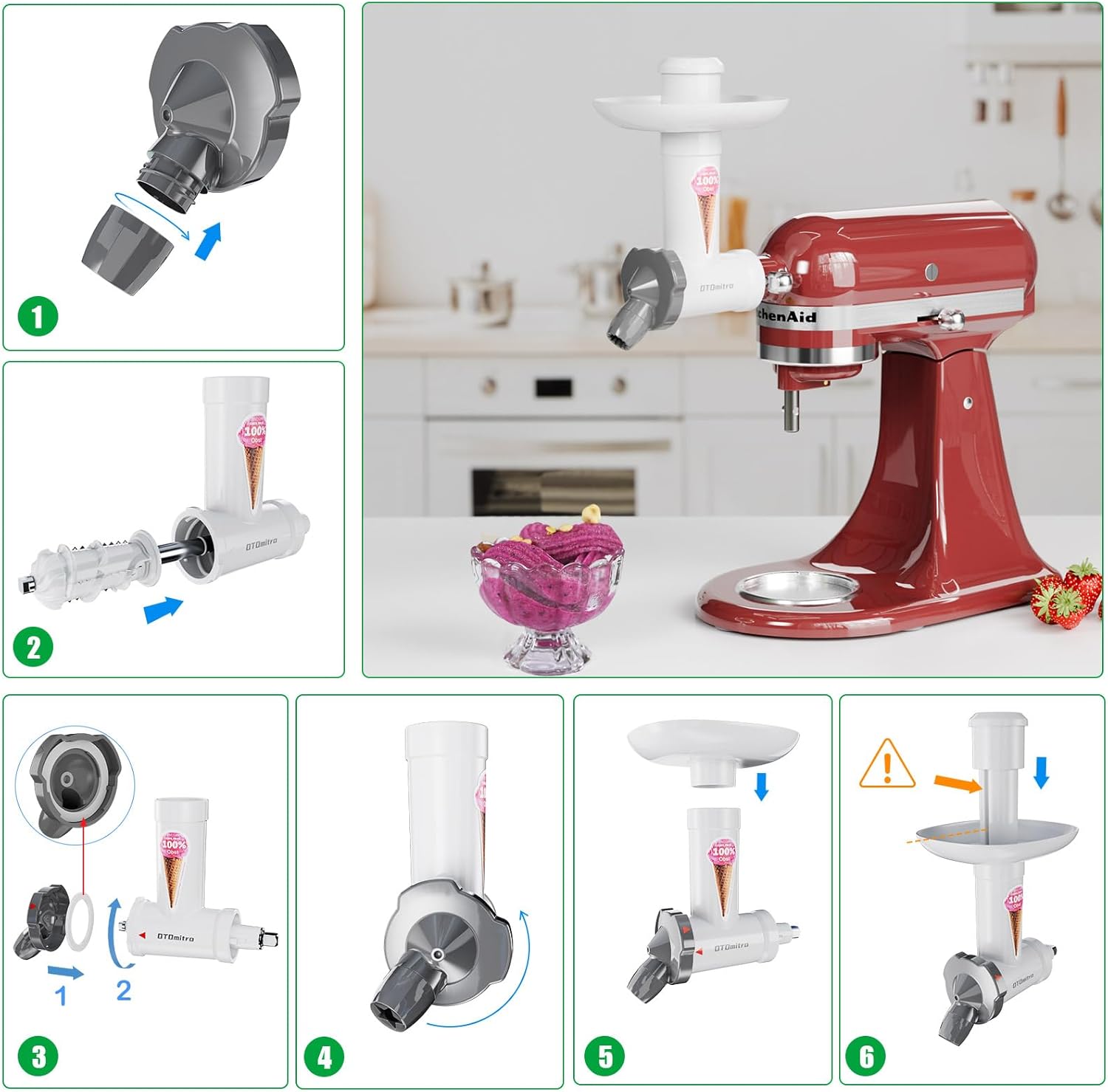 - ✅Entwickelt für Kitchenaid - Der OTOmitra Eisaufsatz Aufsatz ist für Kitchenaid Mixer geeignet und langlebig und leistungsstark. Fügen Sie einfach Ihre Lieblingsfrüchte wie Bananen und Mangos hinzu, um Fruchteis herzustellen, und geniessen Sie