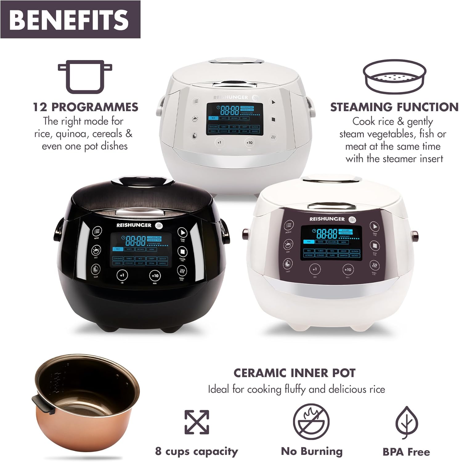- 🍚 12 KOCHMODI + 1 GRATIS KOCHBUCH – Damit du direkt durchstartest, kommt der Reiskocher jetzt mit unserem Reiskocherkochbuch! Lass dich von den Rezepten inspirieren und entdecke die 12 verschiedenen Programme: Reis, Weisser Reis, Vollkorn Reis, Sushi Reis, Crispy, Congee, Turbo, Quinoa, Getreide, Suppe, Dämpfen und Backfunktion
