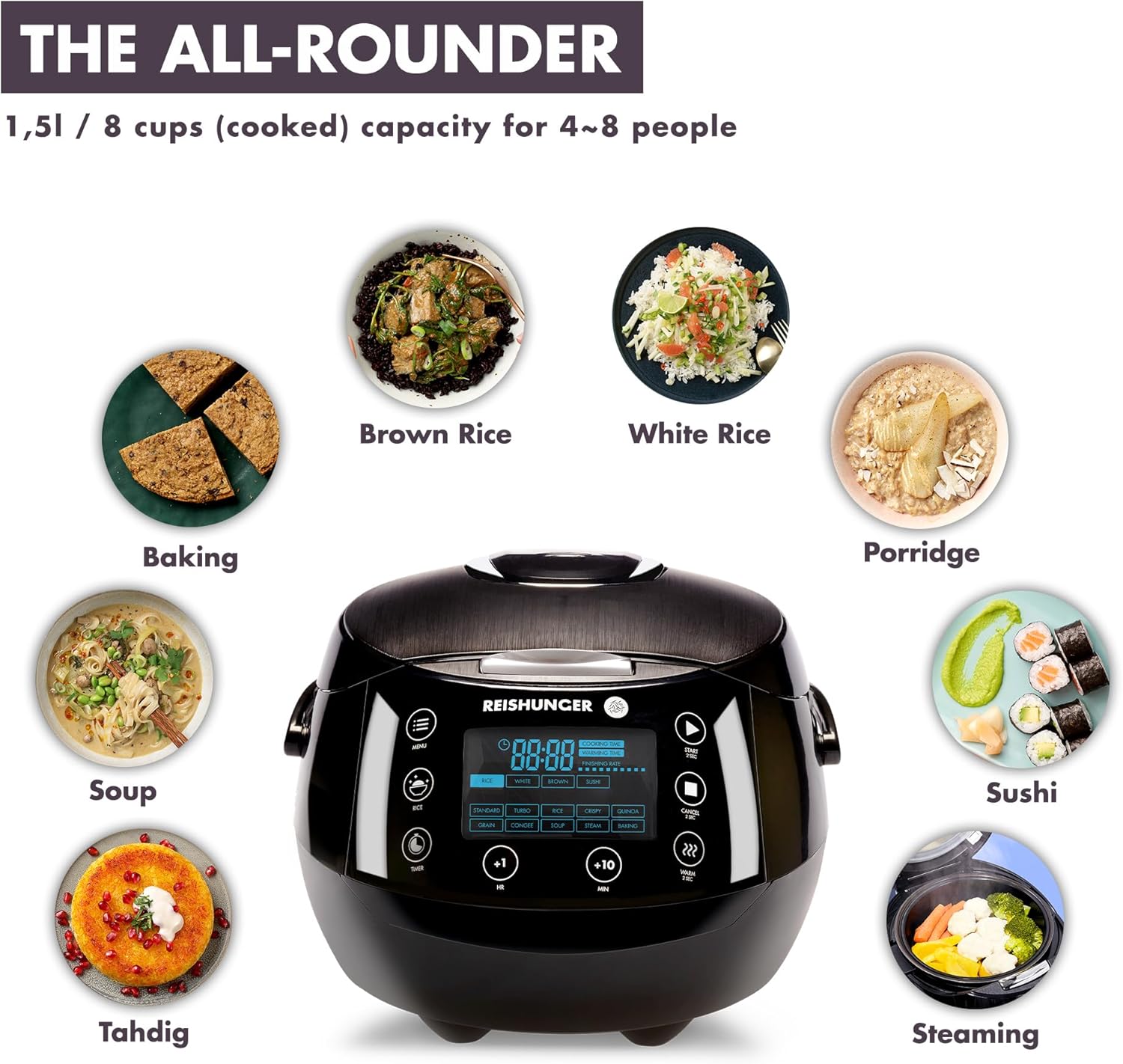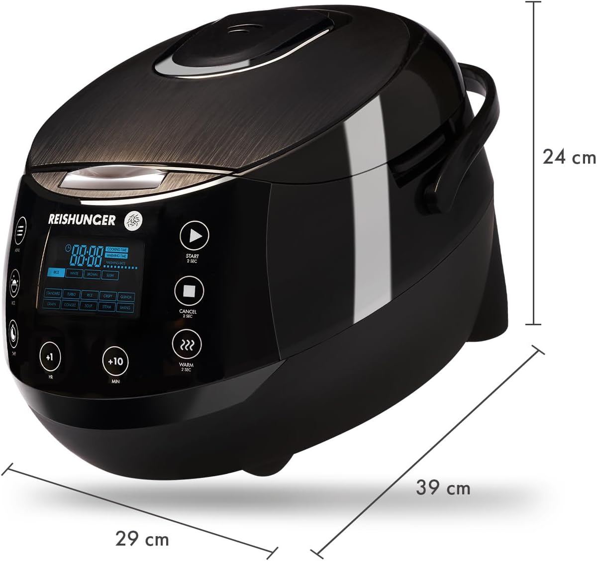 - 🙂 INTUITIVE BEDIENUNG & KOMFORTABLE NUTZUNG – Intuitive Bedienung dank einfacher Menüführung und gut beleuchtetem modernen Display. Nützliche Timer- und Warmhaltefunktion für herrlich leckeren Reis zur Wunschzeit