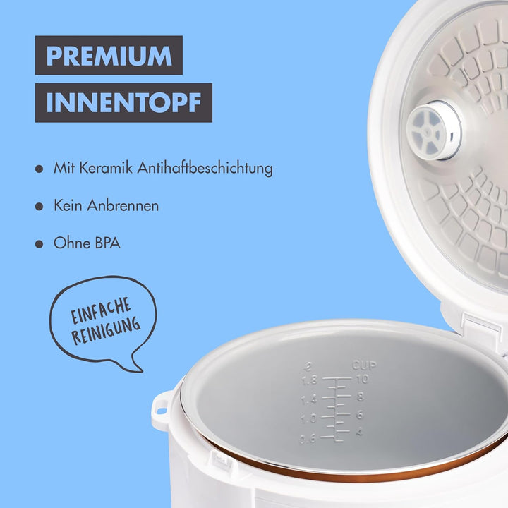 • đź’Ž KERAMIK INNENTOPF OHNE ANBRENNEN – Hochwertiger Innentopf bestehend aus 3 verschiedenen Schichten (Keramik, Aluminium und Bronze). Die gesundheitlich unbedenkliche Keramikbeschichtung sorgt fĂĽr perfekt gegarten Reis und lässt keinen Reis am