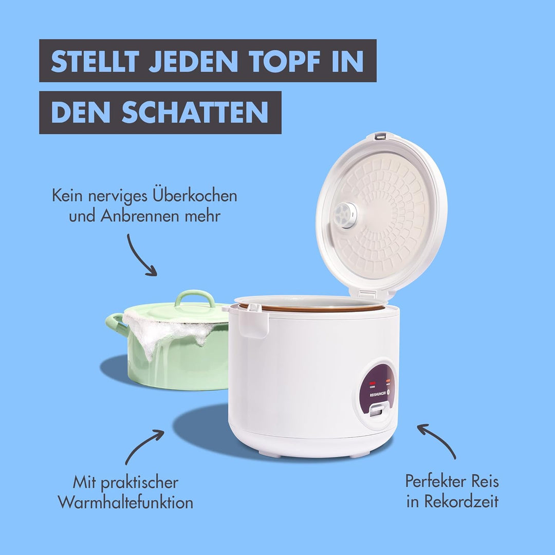 • 🍚 PERFEKT GEGARTER REIS – Unser Reishunger Reiskocher ist bestens geeignet fĂĽr alle möglichen Reissorten wie z. B. Sushi Reis, Duft Reis, Naturreis und Basmati Reis. Der Reiskocher schaltet sich automatisch in den Warmhaltemodus, sobald der Reis