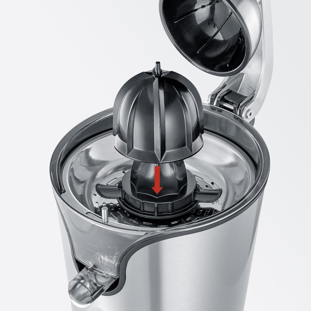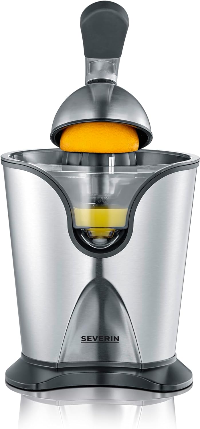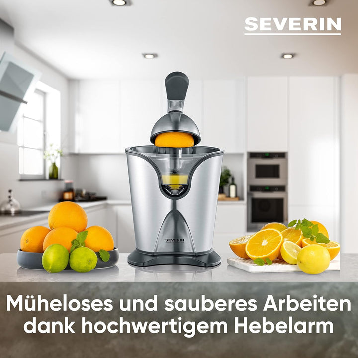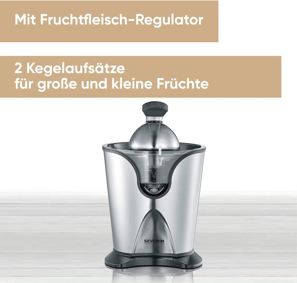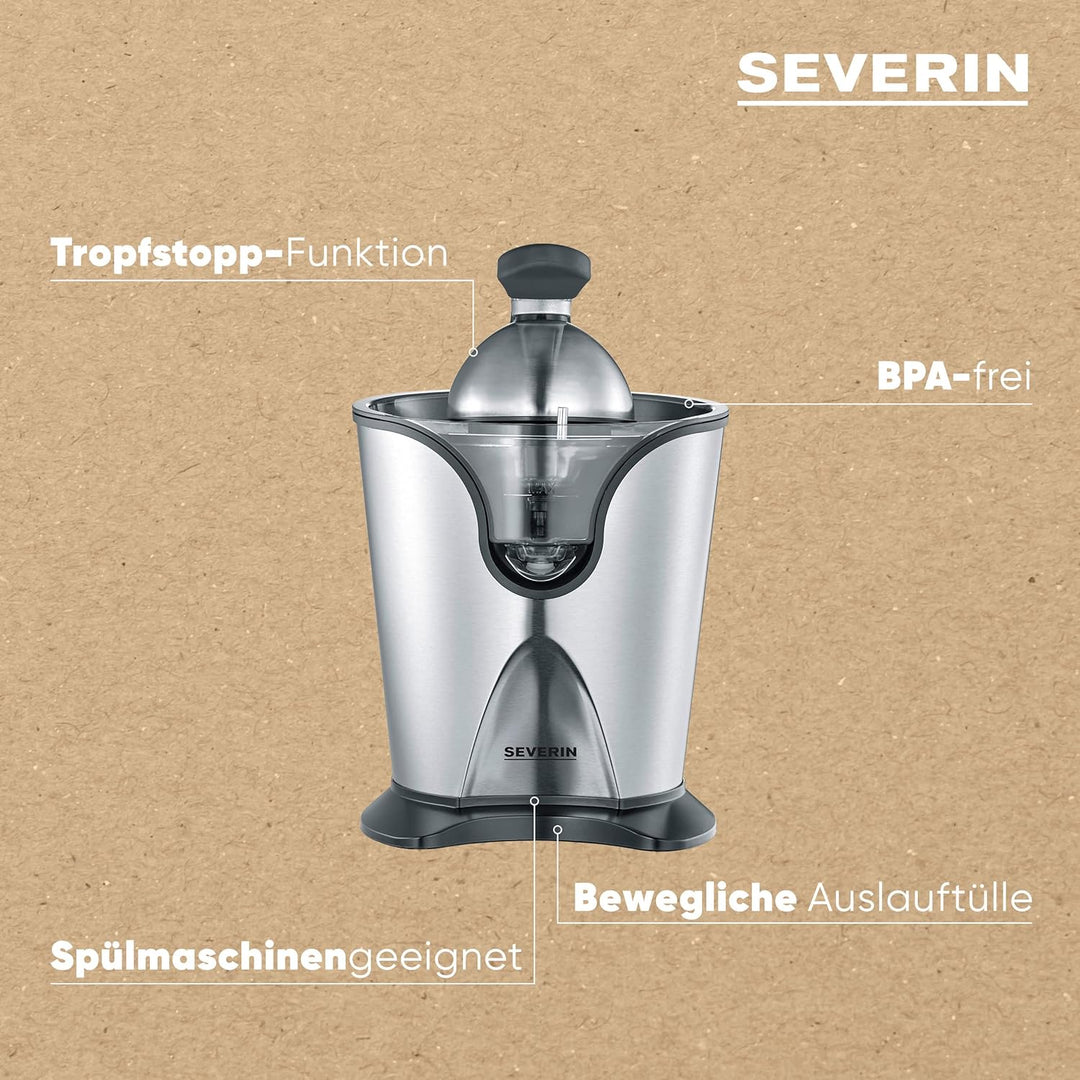 - Details – SEVERIN Citruspresse mit Hebelarm, bewegliche Auslauftülle mit Tropfstopp-Funktion, 2 Aufsätze für grosse und kleine Früchte, 160 W, Edelstahl-gebürstet / schwarz, Artikelnr. 3544