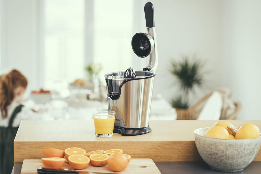 - Hohe Saftausbeute – Müheloses und sauberes Arbeiten gelingt leicht mit dem flexiblen Hebelarm aus Aluminium-Druckguss: für Orangen, Zitronen, Limetten etc.