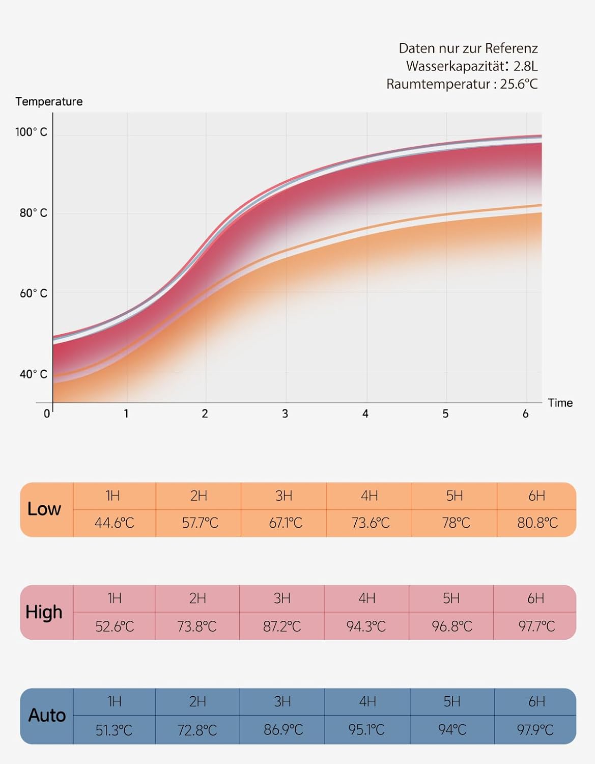 - drei Kocheinstellungen: Auto, niedrige und hohe Hitzeeinstellungen, mit denen Sie die Kontrolle über das Garen Ihrer Speisen haben. Geniessen Sie die intensiven Aromen von langsam gekochten Speisen, auch wenn Sie den ganzen Tag unterwegs sind!