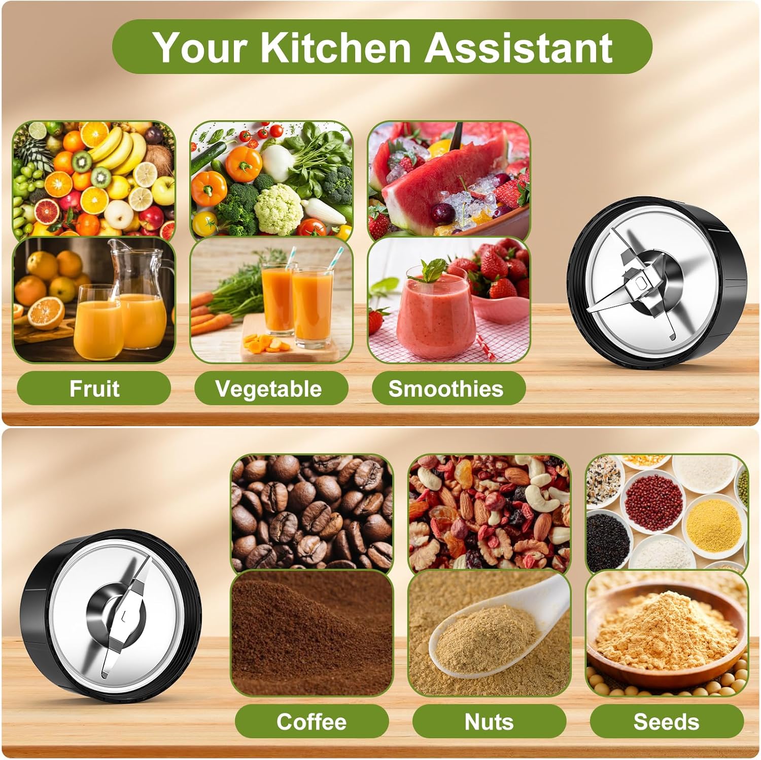 - 【2】🥤2-in-1 Multifunktion: Unsere standmixer ist mit 6 klingen und 2 klingen ausgestattet. Die 6-blatt-klinge wird für die zubereitung von saft, milchshakes und smoothies verwendet, die 2-blatt-klinge für kaffeebohnen, müsli, sojabohnen und