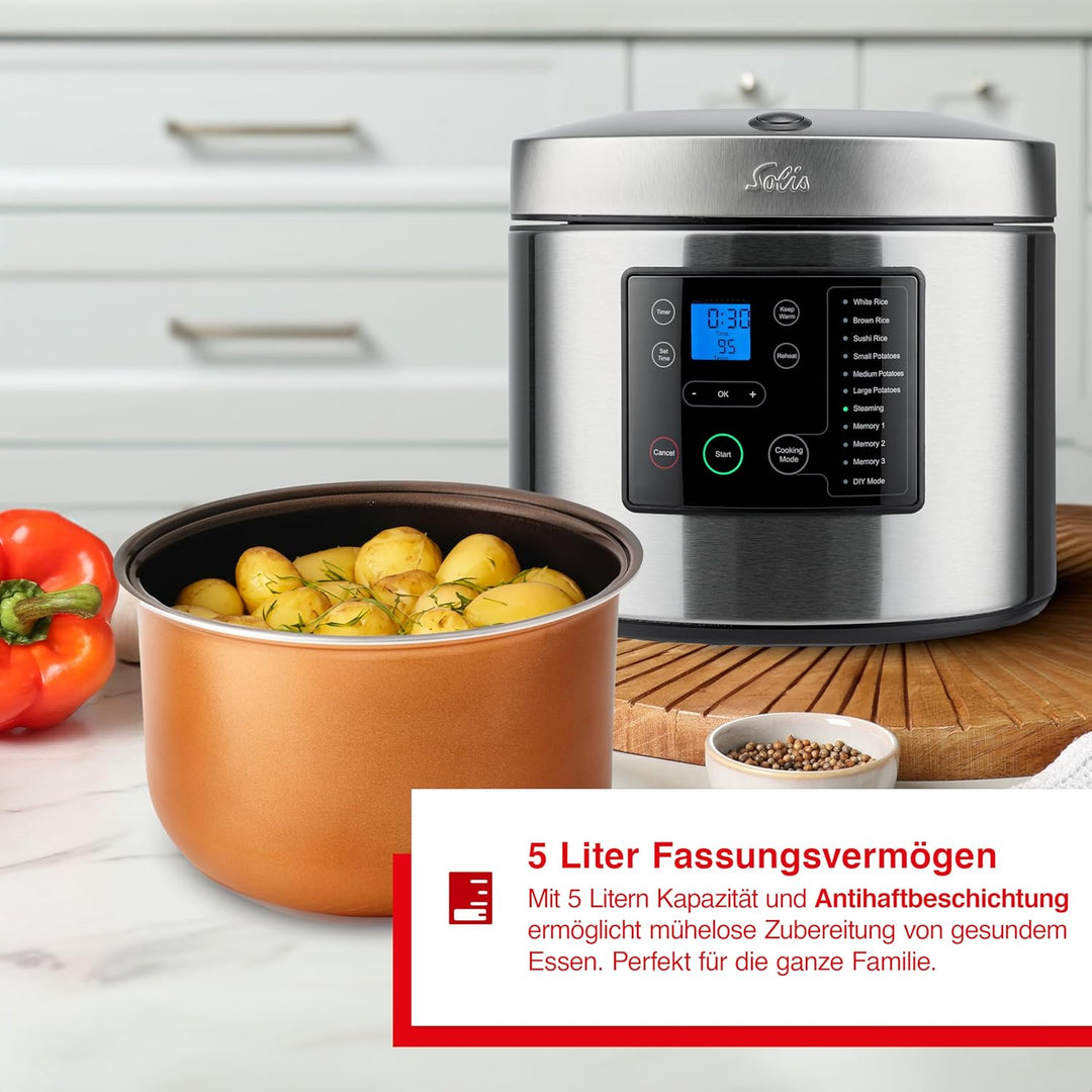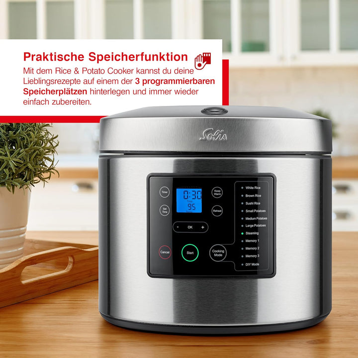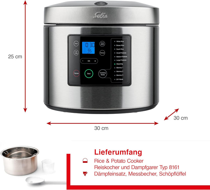 - LIEFERUMFANG - Solis Rice & Potato Cooker 8161 Reis- und Kartoffelkocher, Dämpfkorb, Kochtopf, Rice & Potato Paddle und Messbecher