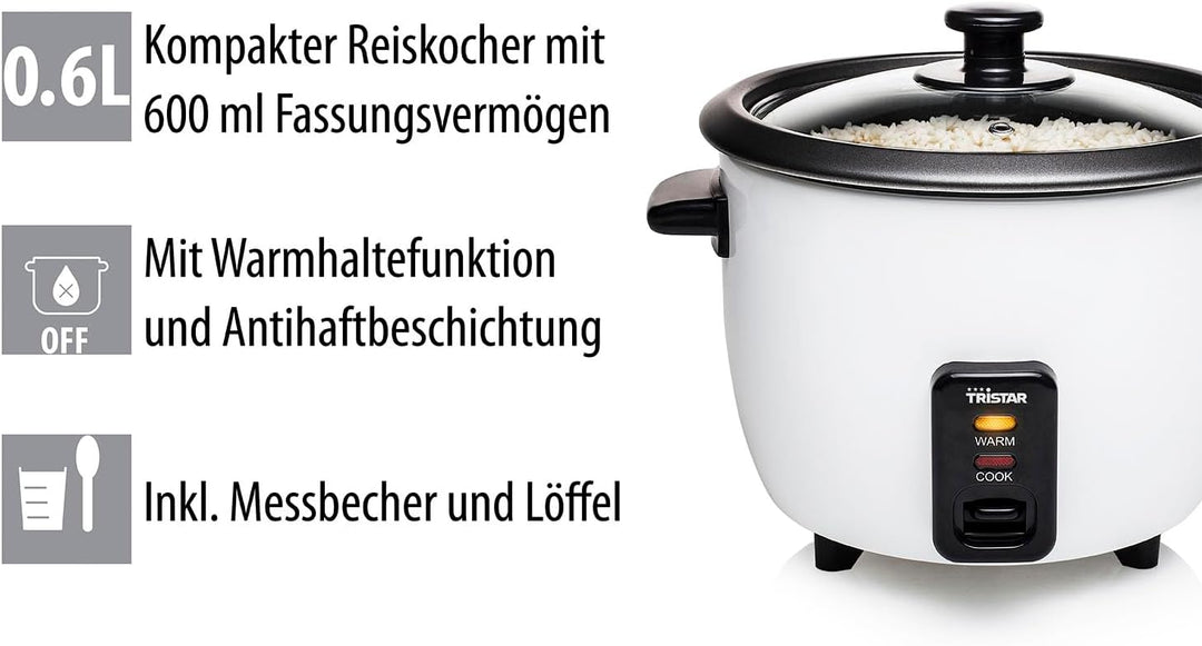 - Kleiner Reiskocher mit 300 Watt und 0,6 Liter Inhalt für 3 Portionen Reis
