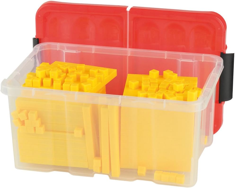 - Inhalt: 100 Einerwürfel, 10 Zehnerstangen, 10 Hunderterplatten und 1 Tausenderblock, Farbe: Gelb