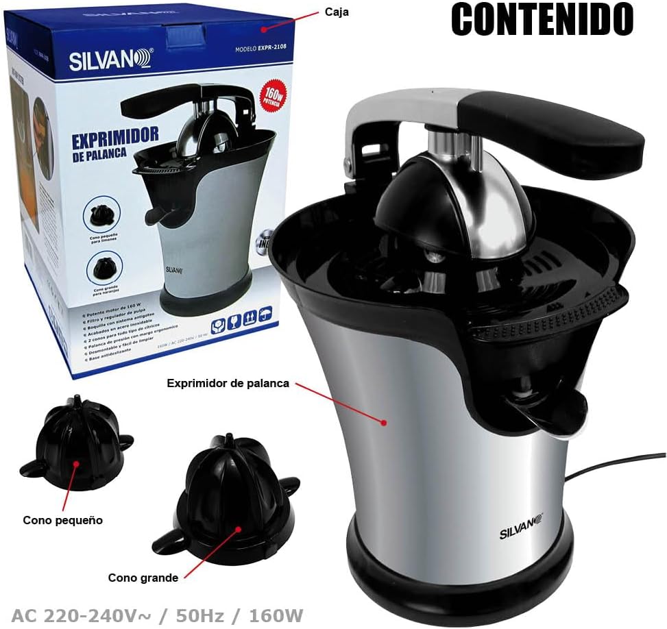 Silvano Elektrische Zitruspresse, Orangenpresse mit Druckhebeln, Saftextraktor 160 W, Düse aus Edels