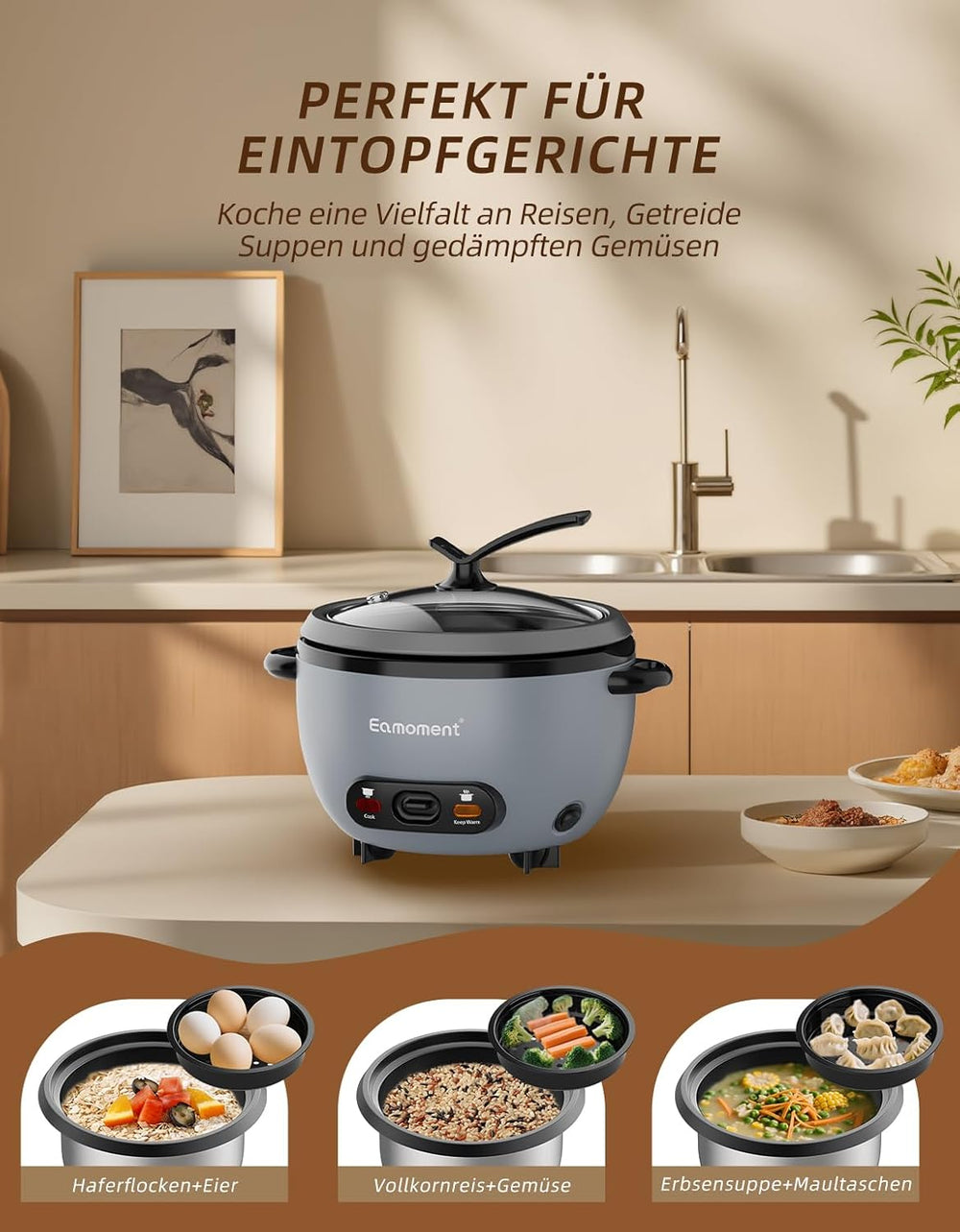 Eamoment ERC-5P07SL 1L | 400W Reiskocher & Schwarzer Dämpfeinsatz Warm & Kochen 1-5 Personen Antihaf