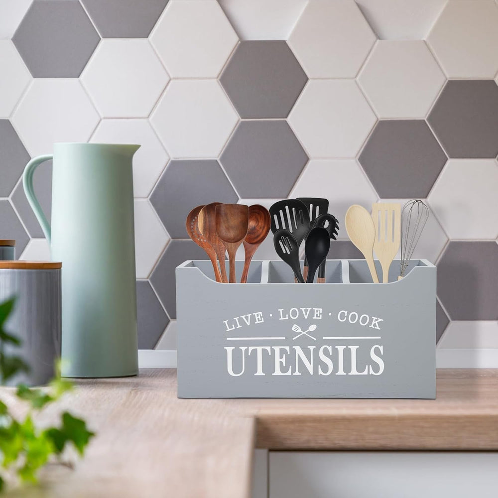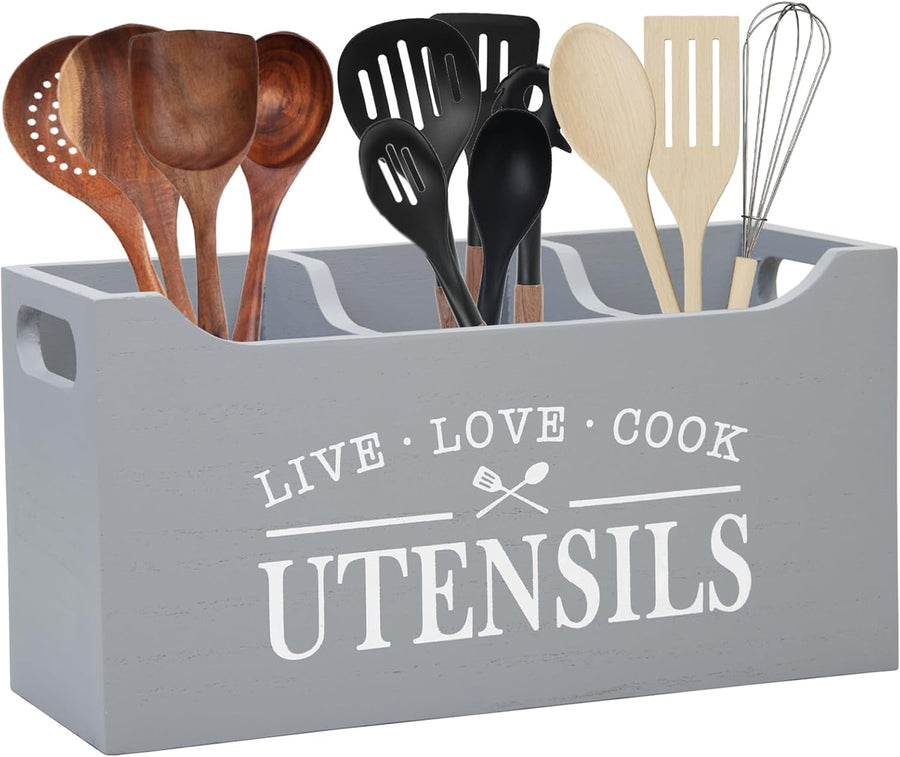 Karisky Kitchen Utensil Holder with Drainage Bottom, Large 3 Compartments Solid Real Wood Utensil Or