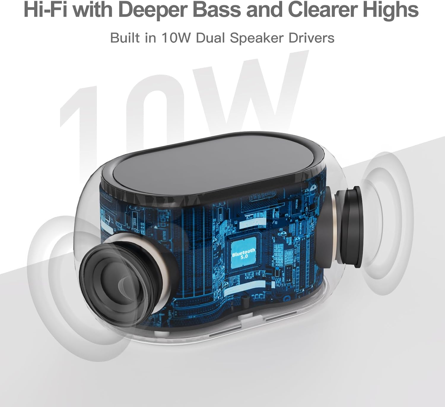 - Bluetooth 5.0 & Hi-Fi-Stereo-Sound: Ausgestattet mit Bluetooth 5.0 und 10W-Doppellautsprechern, bietet es kraftvolle Bässe und klare Höhen. Die Bluetooth-Verbindung stellt die Zeit automatisch ein und bleibt auch während der Sommerzeit präzise.